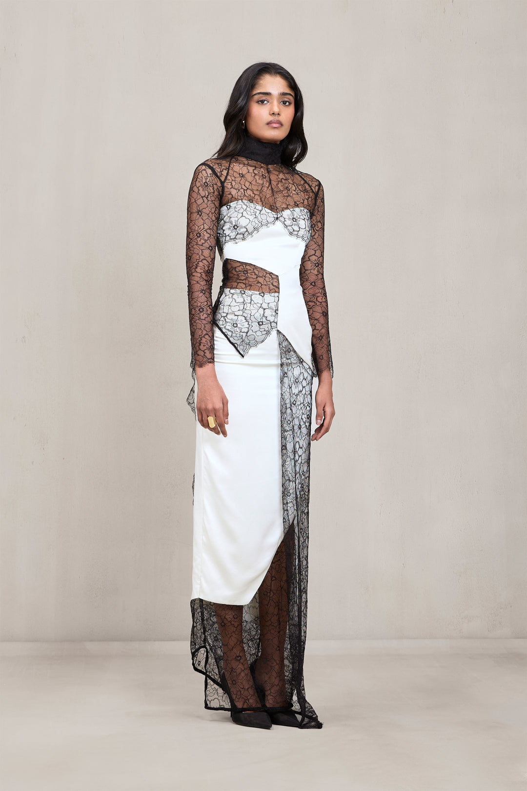 Architectural elegance meets feminine delicacy in this monochrome gown. The bodice is crafted in sculpted ivory satin with sharp, panelled construction, while a sheer black lace overlay softens the structure with fluid contrast. The lace extends into full sleeves and a floor-length drape, creating a play of opacity and transparency. Angular satin cut-outs at the waist add edge, making this gown an interplay of strength and sensuality.