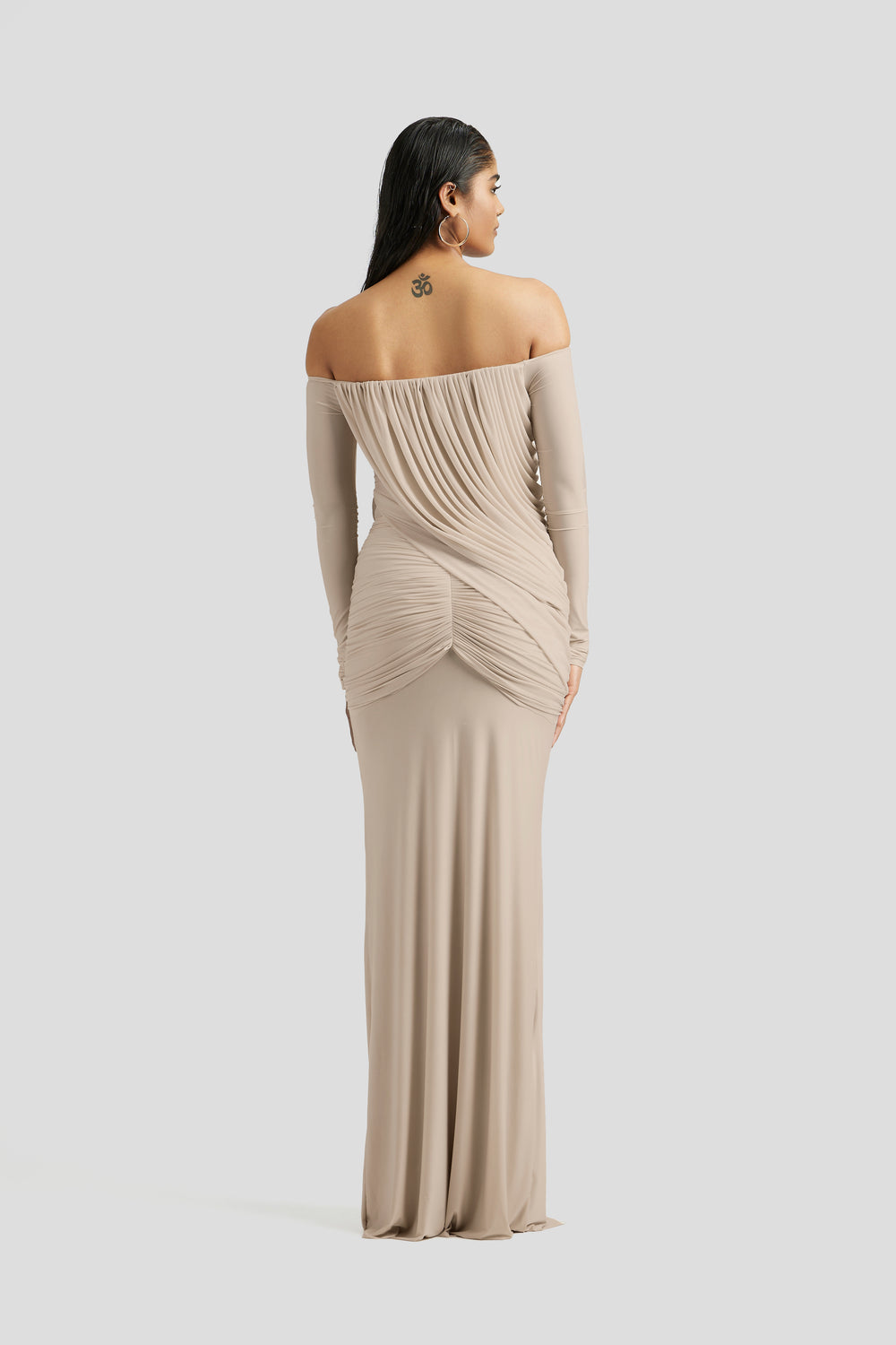 This elegant gown features a rushed waist and a beautifully draped bodice. Drapes cascade elegantly from the tube neckline, falling over in an enchanting manner. The gown’s design combines sophistication with a touch of whimsy, creating a look that is both refined and captivating.