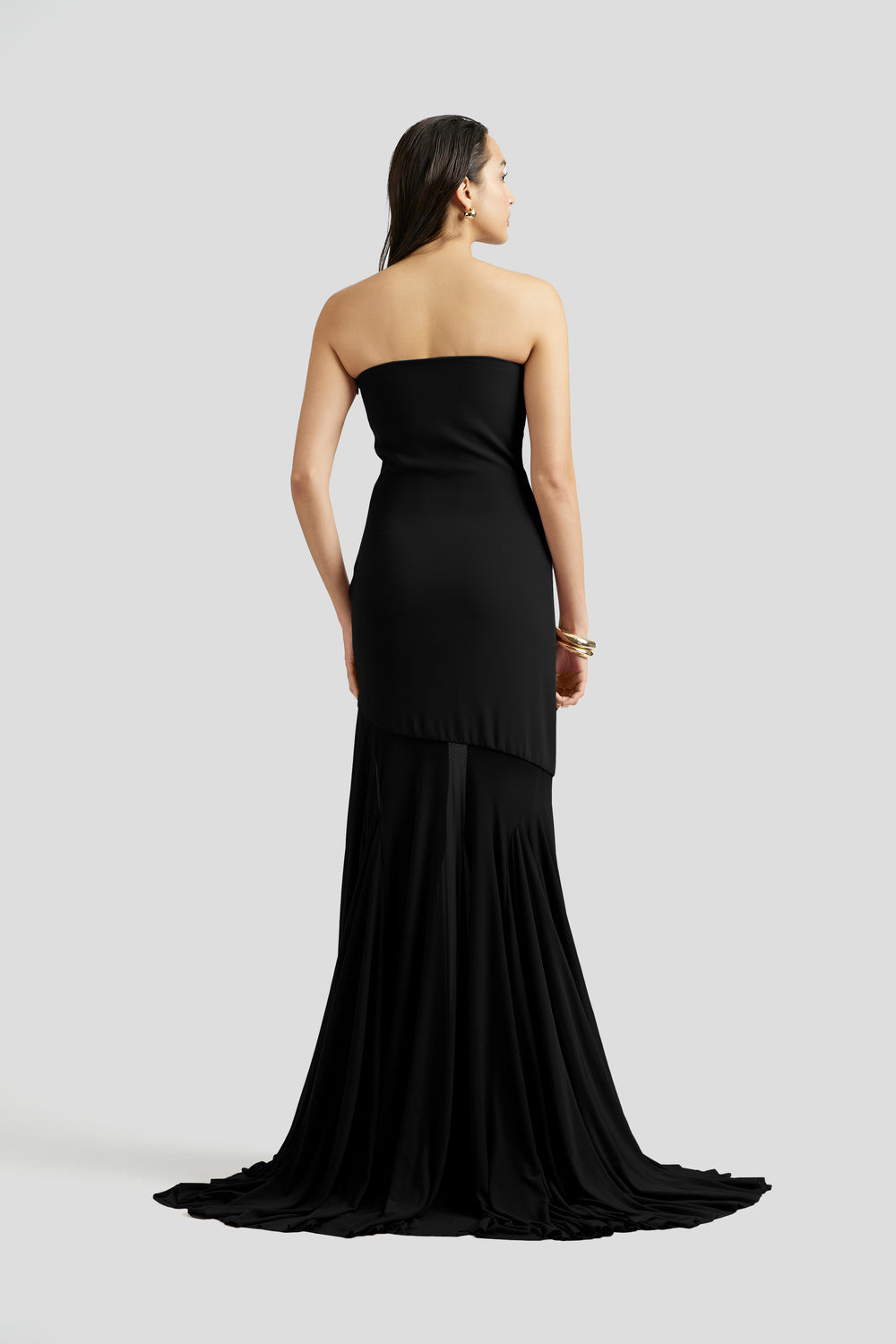 Indulge in the allure of sophistication with this Ferrari asymmetrical tube gown, adorned with flared mesh panels for a touch of whimsical charm. The strapless bodice contours your figure with a flattering silhouette, while the buttery hue infuses warmth and vibrancy into your ensemble. Flowing from the waist down, the flared mesh panels add movement and dimension, creating an enchanting aura as you glide across the room. This gown exudes timeless elegance and feminine grace, ensuring you stand out with effortless poise and style.