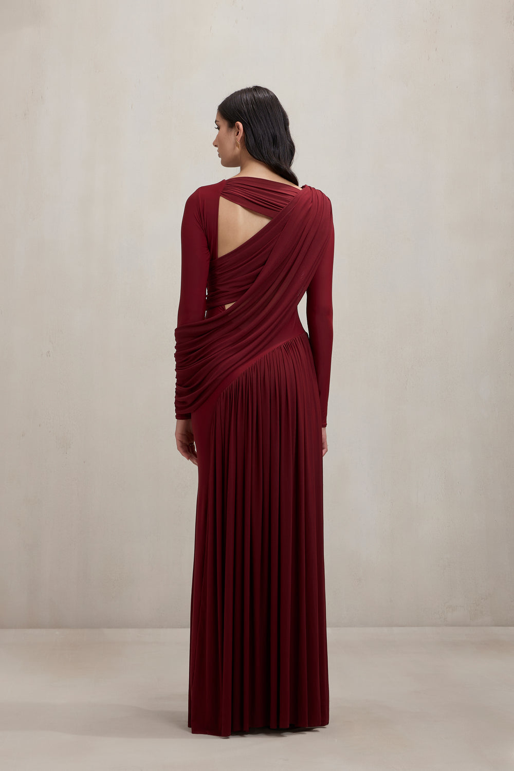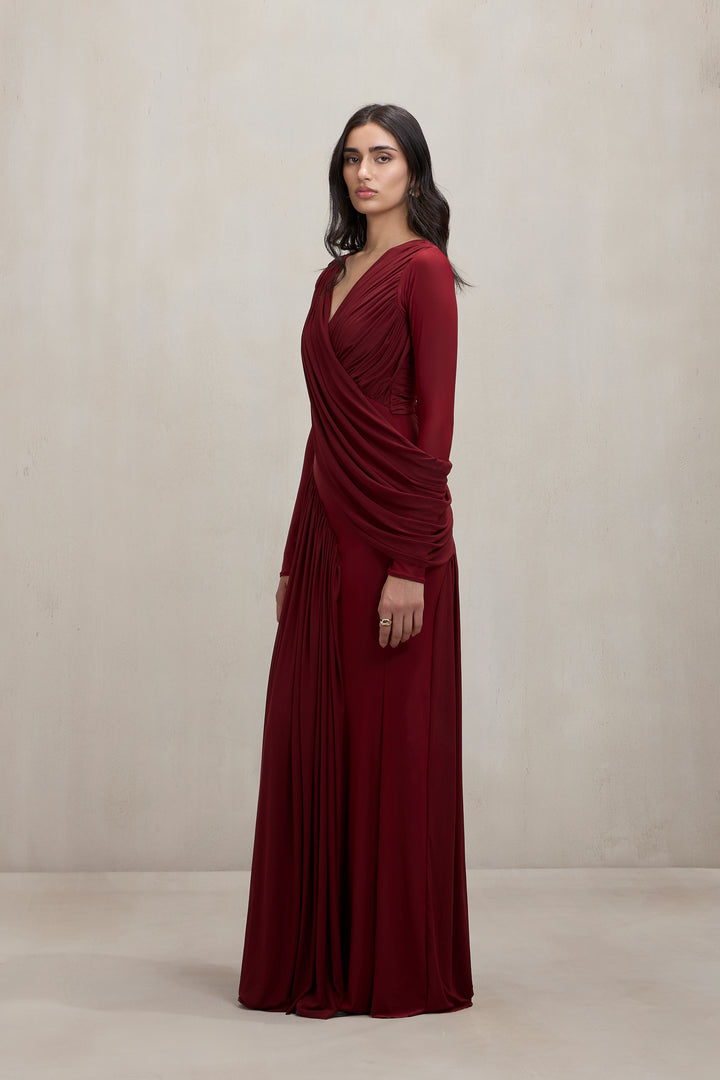 Elegant and architectural, this long-sleeve gown in rich burgundy jersey features a deep V-neckline balanced with dramatic draping across the torso like a detachable drape. Precision pleating and sculpted folds add movement and texture, while the fitted sleeves and floor-grazing length ensure a refined finish. A perfect balance of modern sensuality and sophistication.