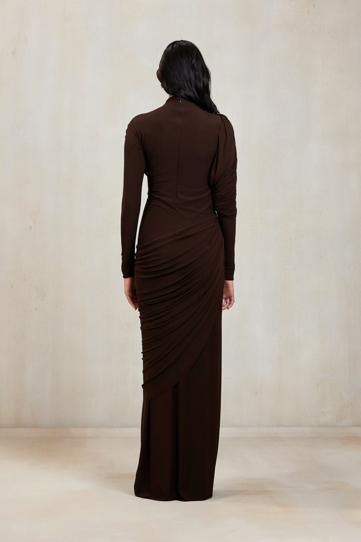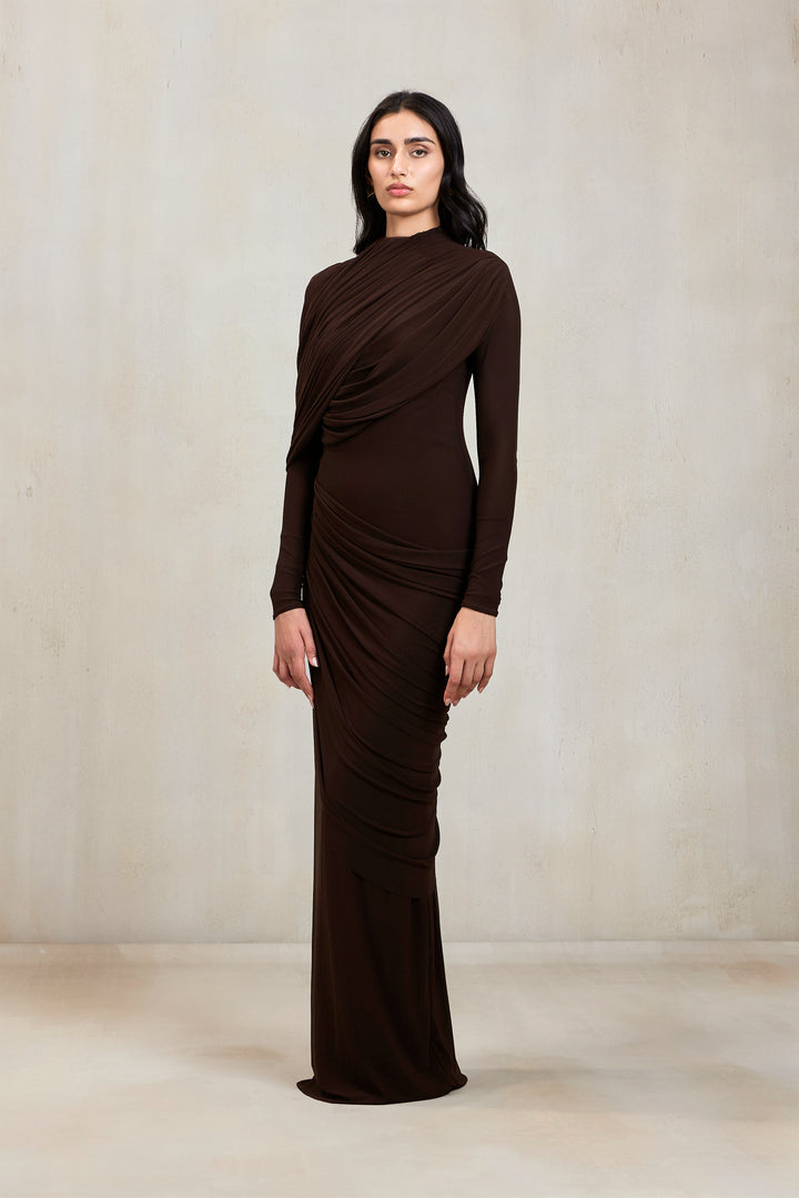 A sculptural silhouette in expresso brown, this high-neck gown features full sleeves and an artfully draped bottom that cascades asymmetrically from one side. At the top, a pleated drape flows from the neckline, elegantly twisting around the arm. A perfect blend of structure and fluidity, this gown redefines modern elegance with a touch of drama.