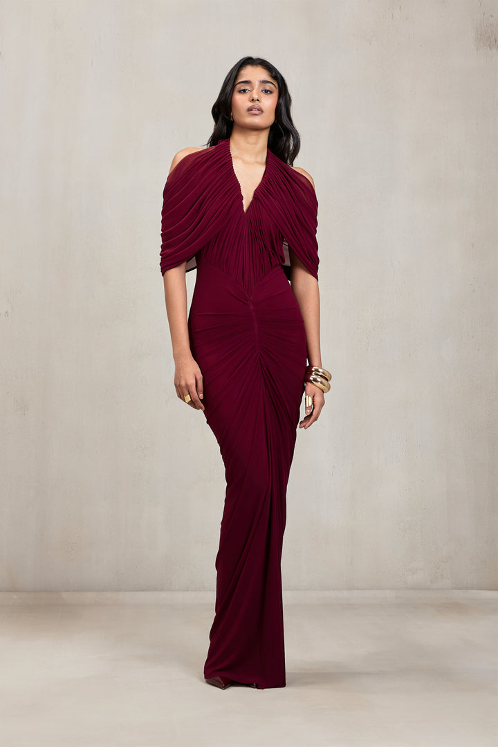 Turn heads with timeless grace in this Cold-Shoulder Draped Gown. Designed with a deep halter neckline and artful pleating throughout, this figure-skimming gown is elevated with cold-shoulder sleeves and a ruched bodice that flatters every curve. The sumptuous aubergine exudes opulence, while the fluid draping adds drama and allure. Perfect for formal events, galas, or red-carpet moments.