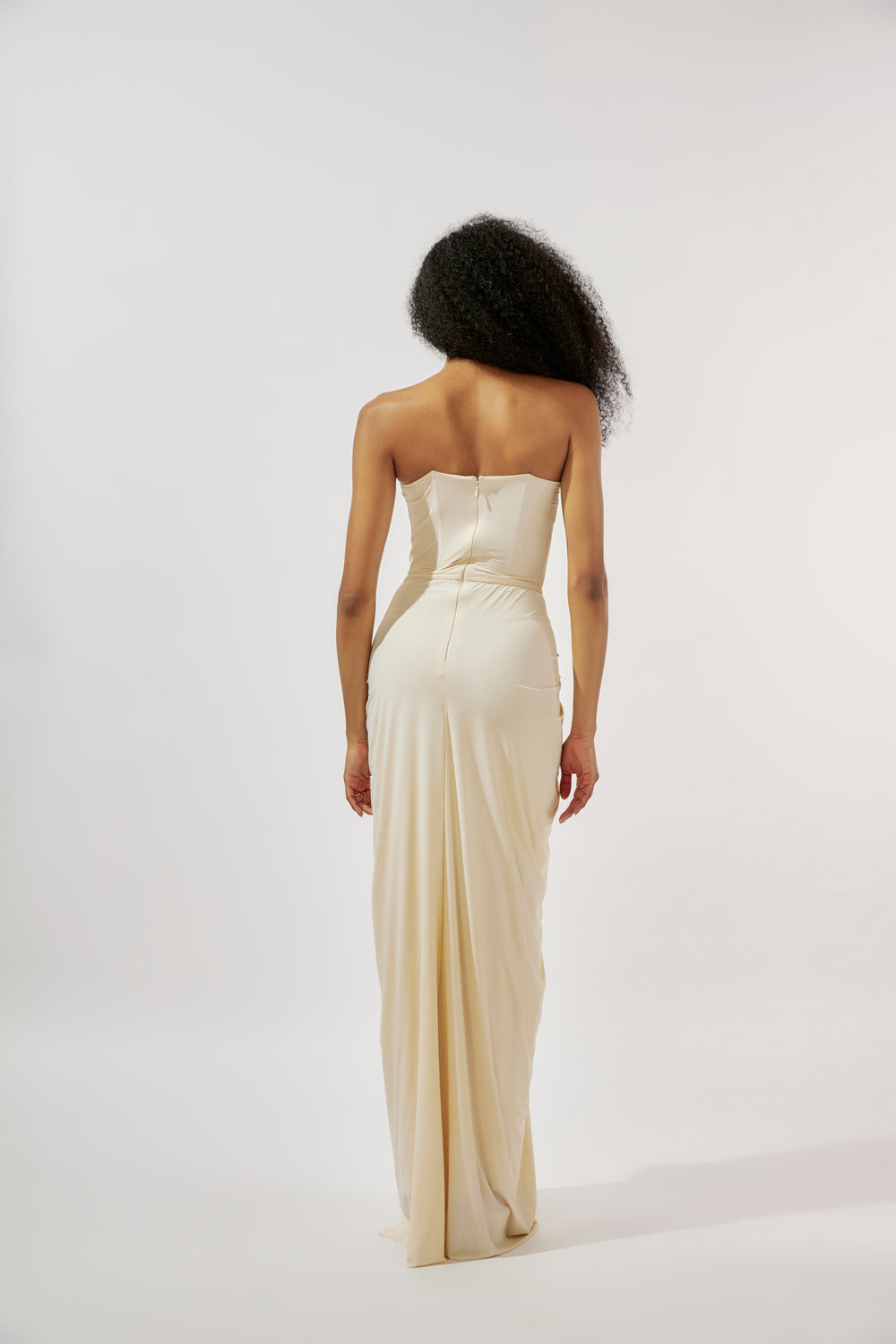 Elegance personified, this Ivory corset gown crafted from luxurious malai fabric exudes sophistication. The skirt is adorned with a sexy draping detail, adding a touch of allure and charm. Perfect for those seeking to make a refined yet striking statement at any formal affair.