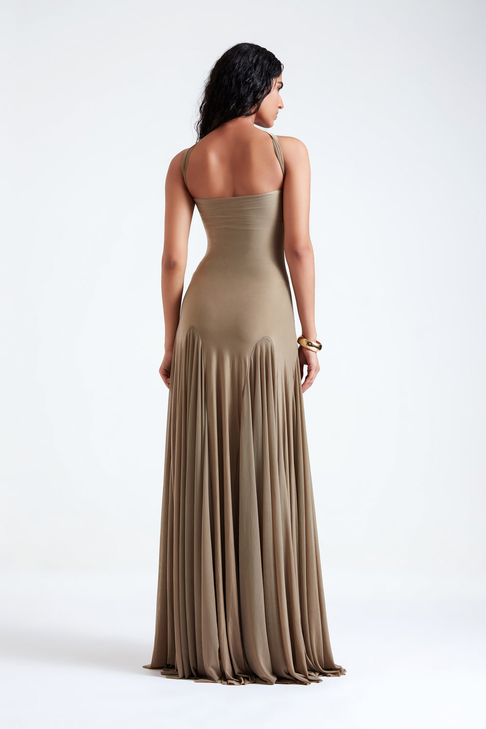 This elegant strapless gown seamlessly combines sophistication and drama with its thoughtfully designed details. The gown features a strapless bodice that offers a sleek, seamless look while highlighting the décolletage. The bust is adorned with intricate ruching, flowing from the waist, the gown incorporates high godets that create a beautifully flared silhouette, allowing for graceful movement. The high godets enhance the gown’s dynamic flow, making it ideal for formal events where you want to make a striking impression.