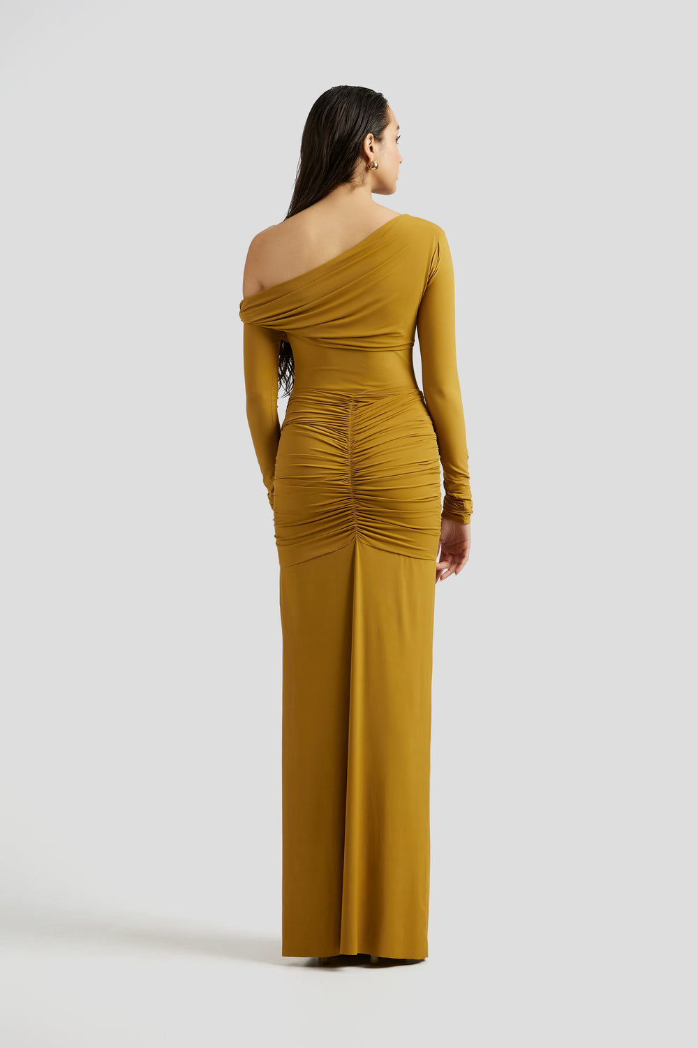 This elegant one shoulder gown features a draped bodice with a drop waist. The standout feature is the tie up detail at the hips. The design exudes a timeless charm, perfect for making a graceful statement.