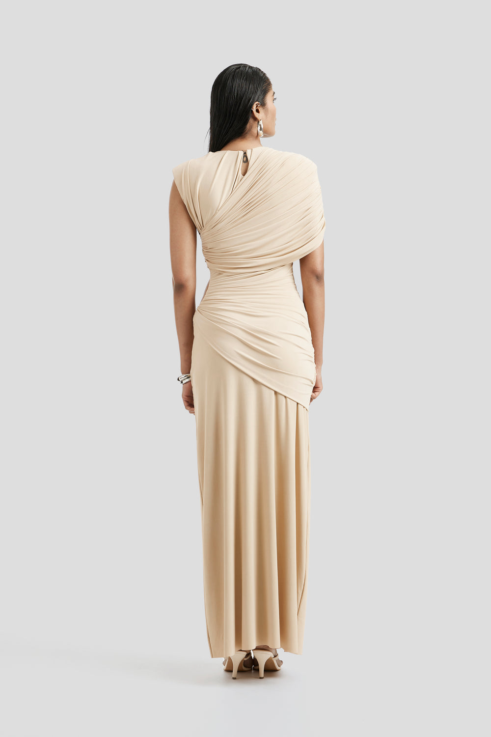 This elegant gown features a draped bodice with exaggerated shoulders. The standout feature is the cutout at the waist. The design exudes a timeless charm, perfect for making a graceful statement.