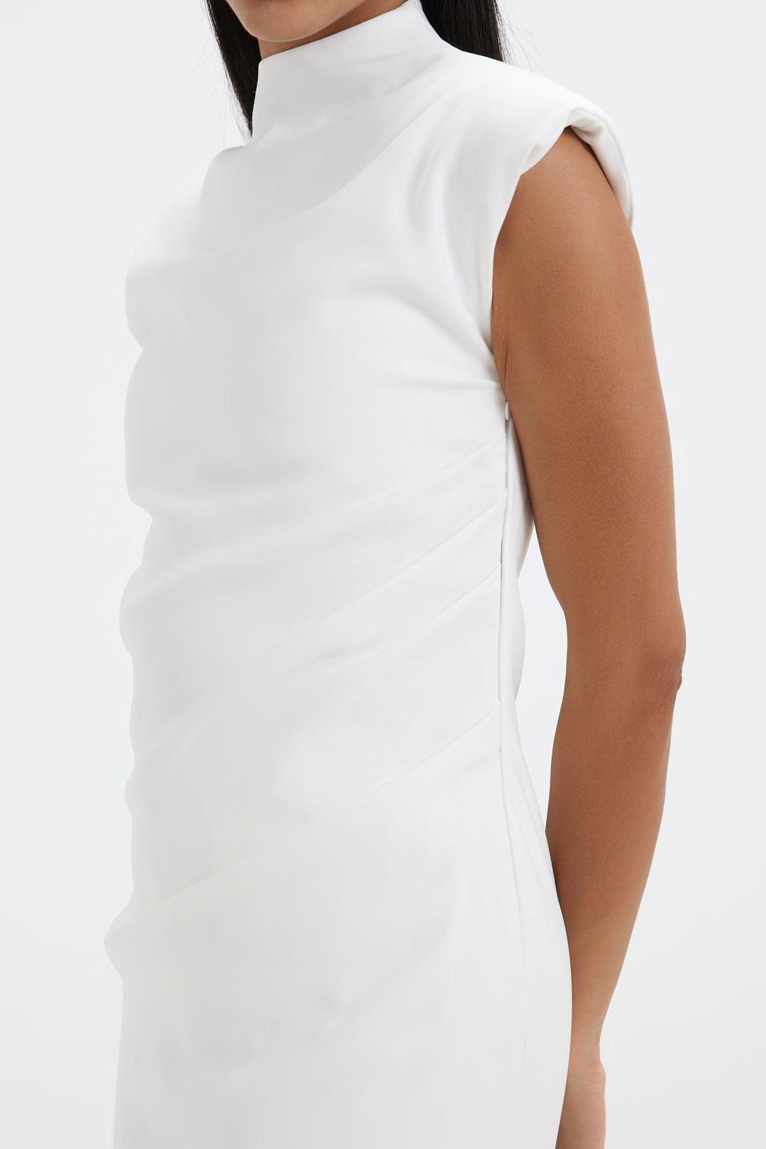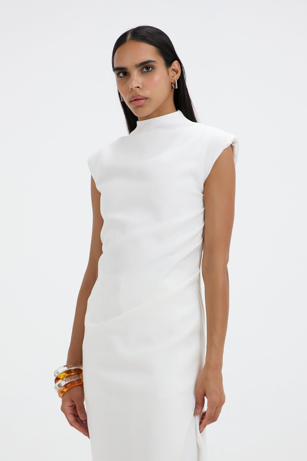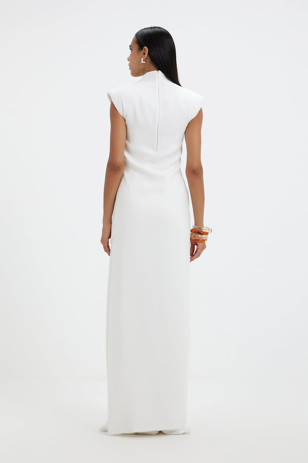 Tailored in a clean, non-stretch fabric, this sleeveless white top makes a powerful statement with structured shoulder pads and a longline silhouette. A side slit adds fluidity to its form, while subtle pleats at the waist sculpt the body with precision. Designed for a sharp yet effortless look, it comes paired with matching flared pants for a minimal, modern finish.