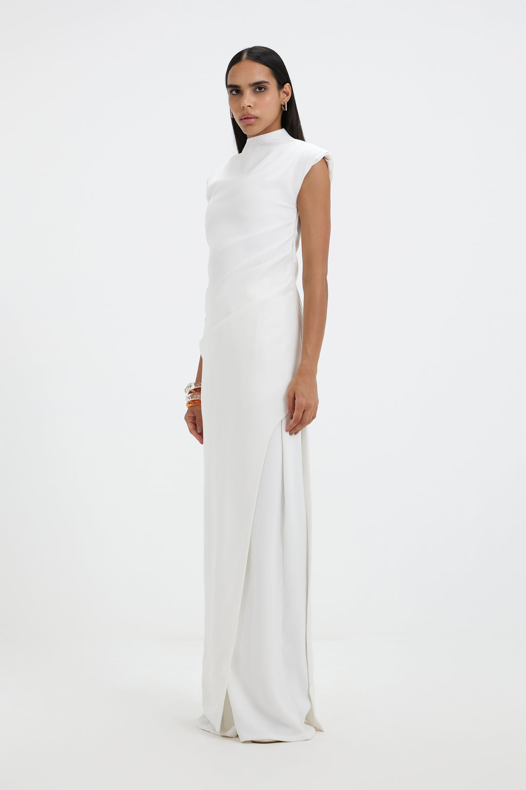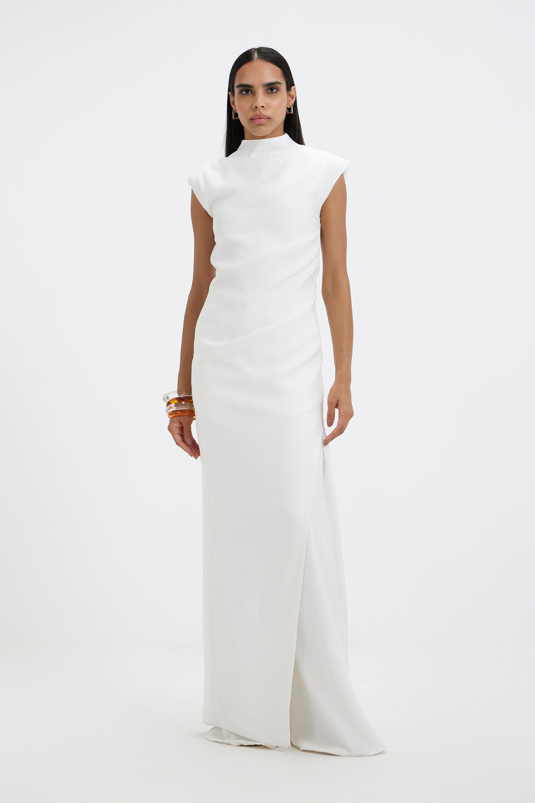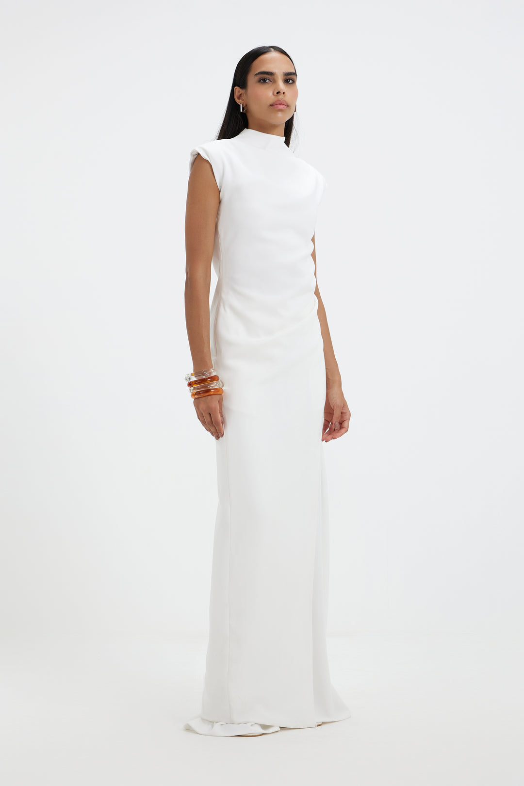 Tailored in a clean, non-stretch fabric, this sleeveless white top makes a powerful statement with structured shoulder pads and a longline silhouette. A side slit adds fluidity to its form, while subtle pleats at the waist sculpt the body with precision. Designed for a sharp yet effortless look, it comes paired with matching flared pants for a minimal, modern finish.