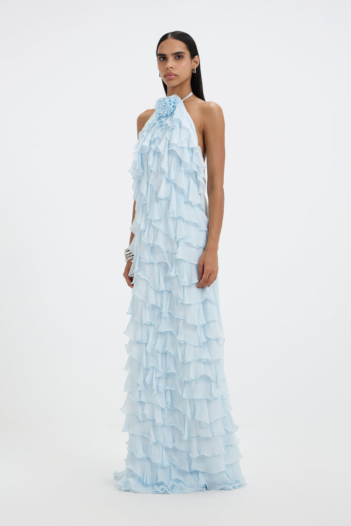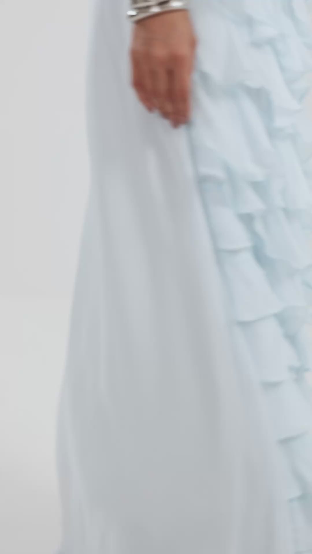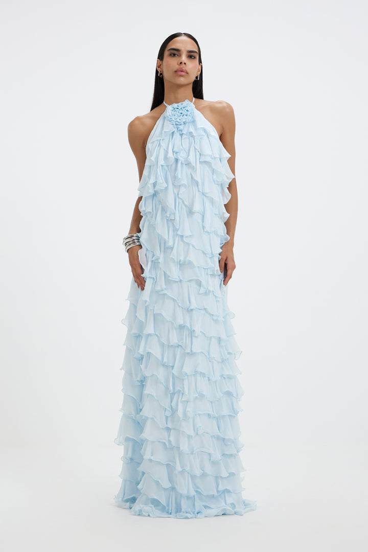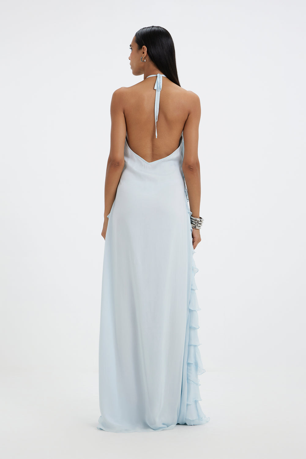 Delicate yet striking, this baby blue chiffon dress is a romantic take on texture and silhouette. Designed in a flattering A-line shape, the front is adorned with a structured cascade of ruffles running from top to hem—adding volume, rhythm, and softness in equal measure. The halter neckline ties gracefully at the neck, while the back features a clean tube finish for a balanced reveal. Light, airy, and full of movement, this piece is a dreamy standout for daytime soirées and twilight affairs alike