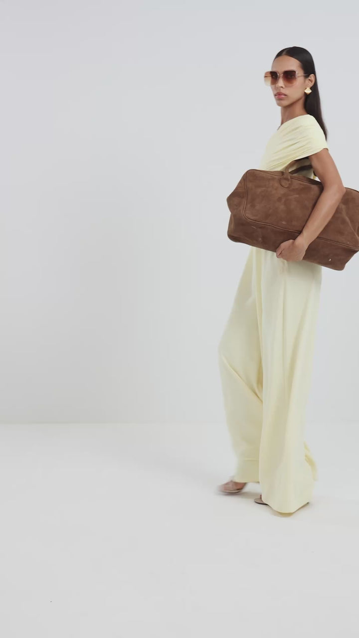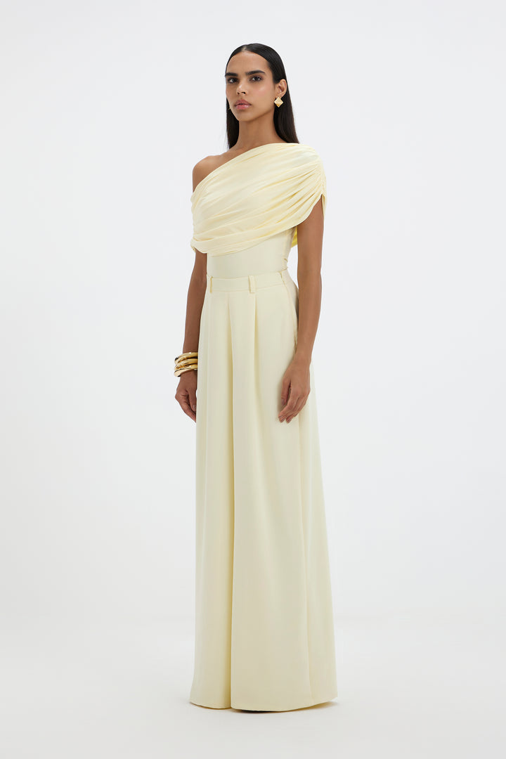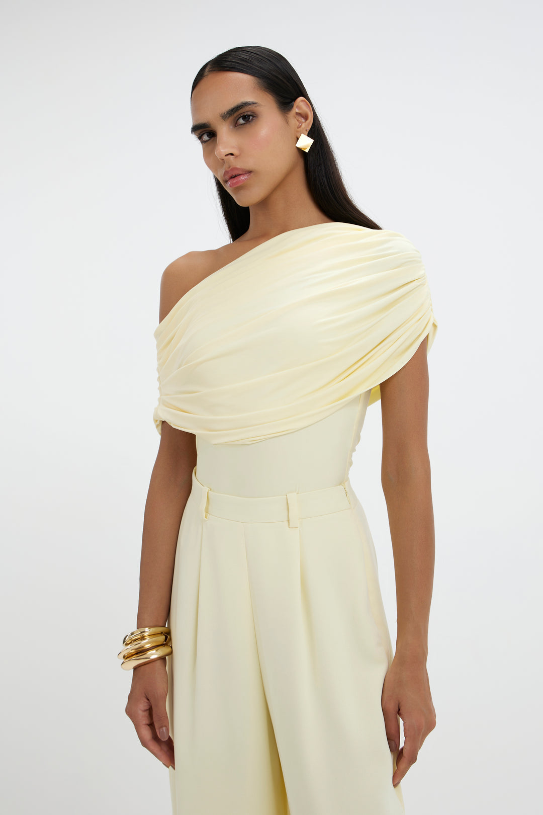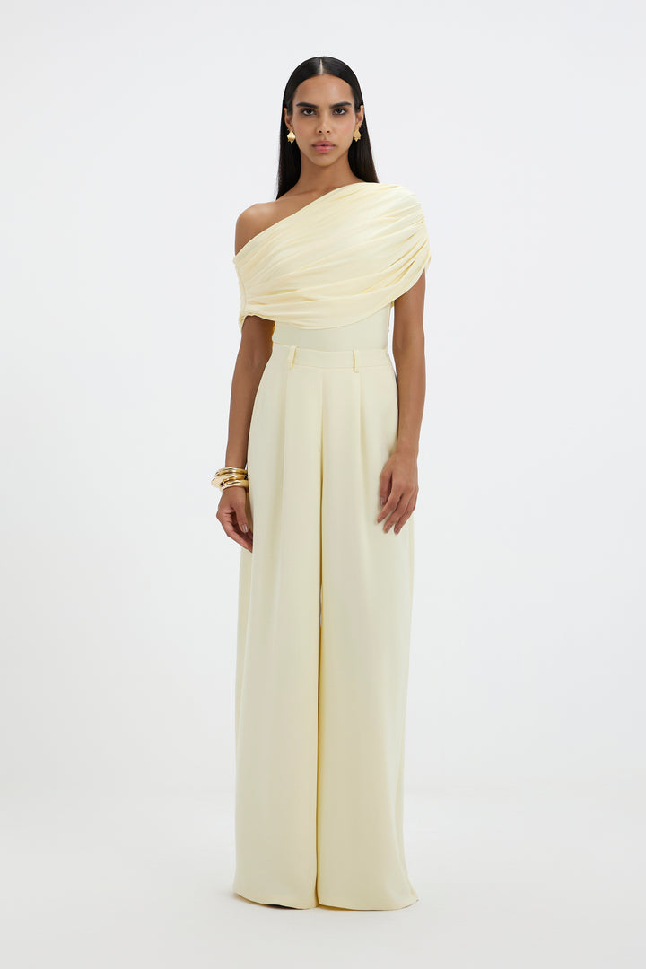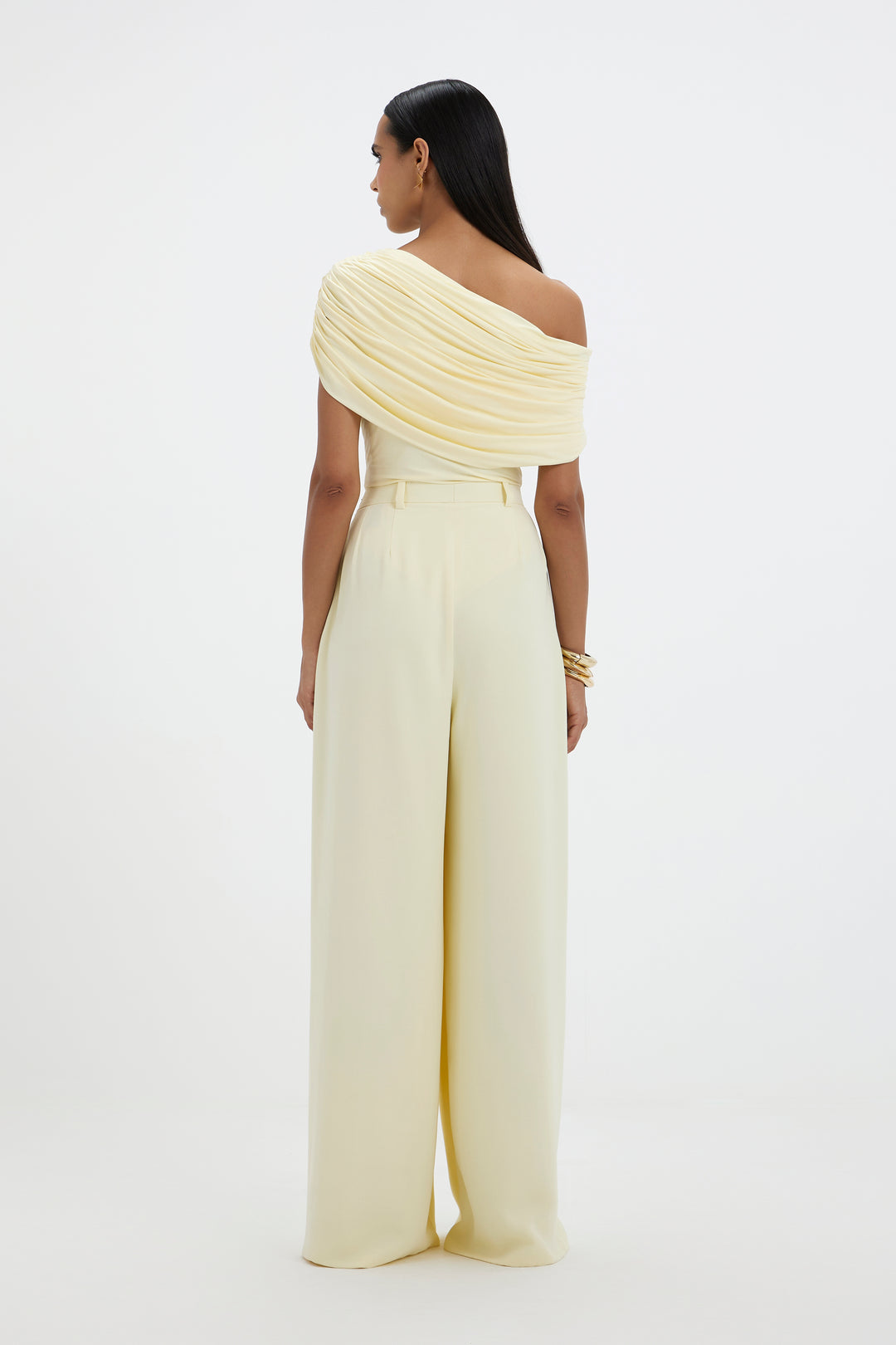 The look features an asymmetric draped bodysuit top with soft pleats that gracefully fall along the body, adding texture and movement. It's paired with flared, high-waisted trousers that offer a streamlined, tailored silhouette, enhancing the overall refined aesthetic.