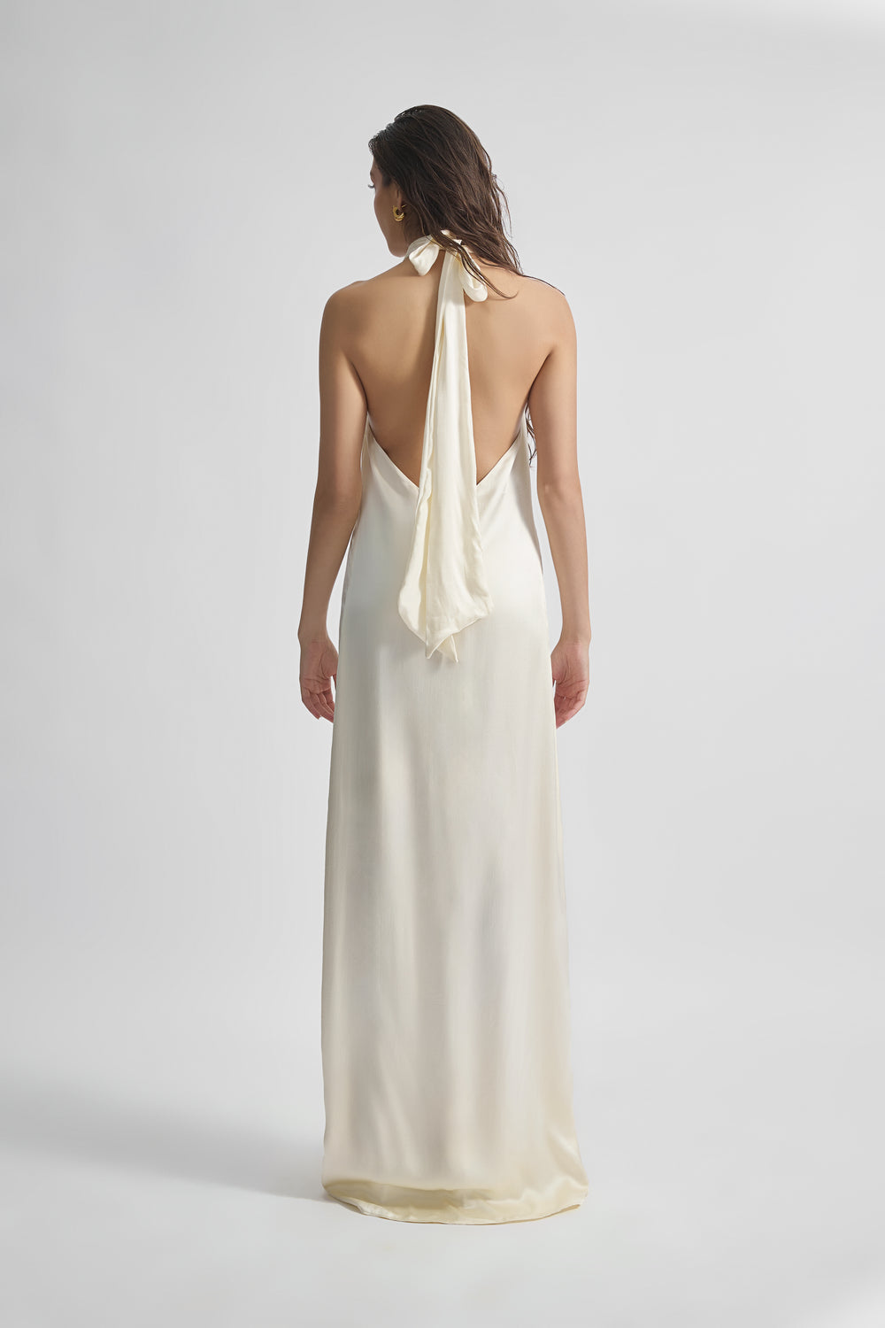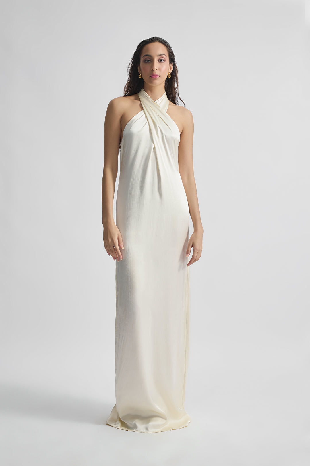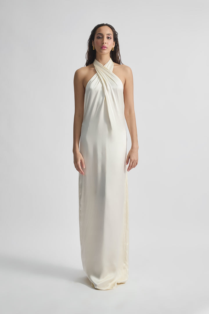 This satin gown exudes timeless allure and sophistication with its exquisite design. Its low V-back adds a touch of sensuality, beautifully complemented by intricate criss-cross detailing at the neckline, creating a captivating visual interest that draws the eye upwards. Crafted from luxurious satin fabric, the gown drapes effortlessly, highlighting the curves of the body with a smooth and lustrous finish. Tailored to flatter, it offers a graceful flow from the neckline to the hem. This gown blends modern style with classic sophistication, ensuring you radiate confidence and poise throughout the evening.