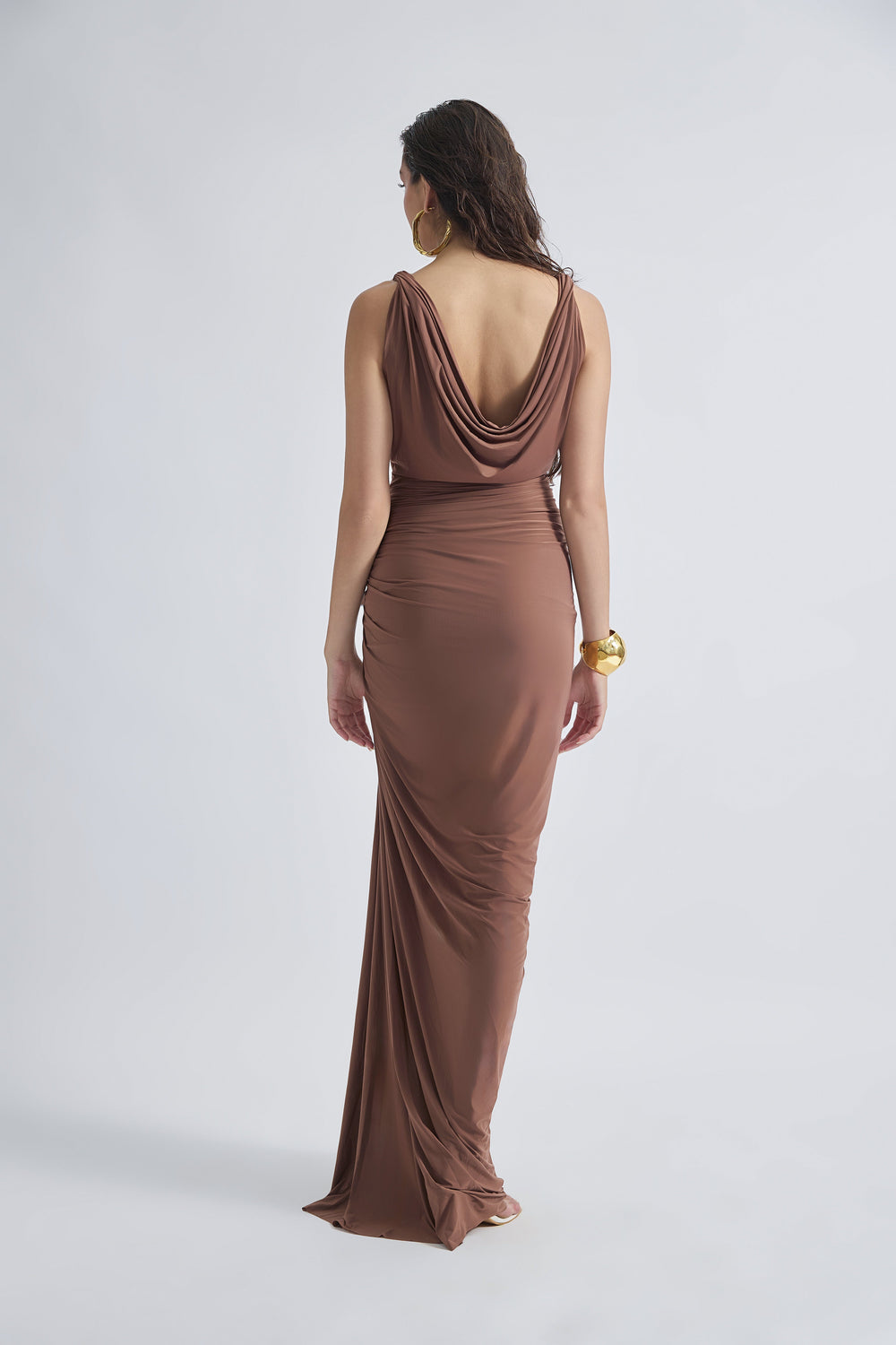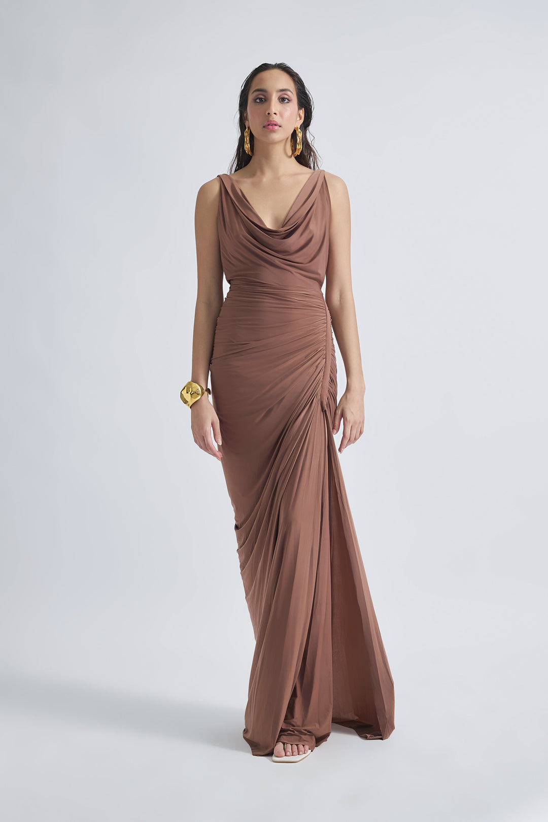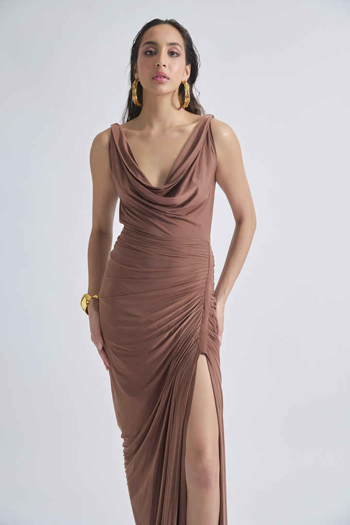 This exquisite Malai Lycra gown exudes sophistication and modern charm with its meticulous design. The gown showcases a graceful cowl neck detailing on the top, adding a touch of elegance and softness to the neckline. Below, a daring high slit adorned with pleats enhances the gown's allure, offering movement and a hint of drama with every step. Crafted from high-quality Malai Lycra fabric, it drapes beautifully, emphasizing the natural curves while ensuring comfort and ease of wear. This gown effortlessly combines timeless style with contemporary elements, making a striking statement of poise and refinement.