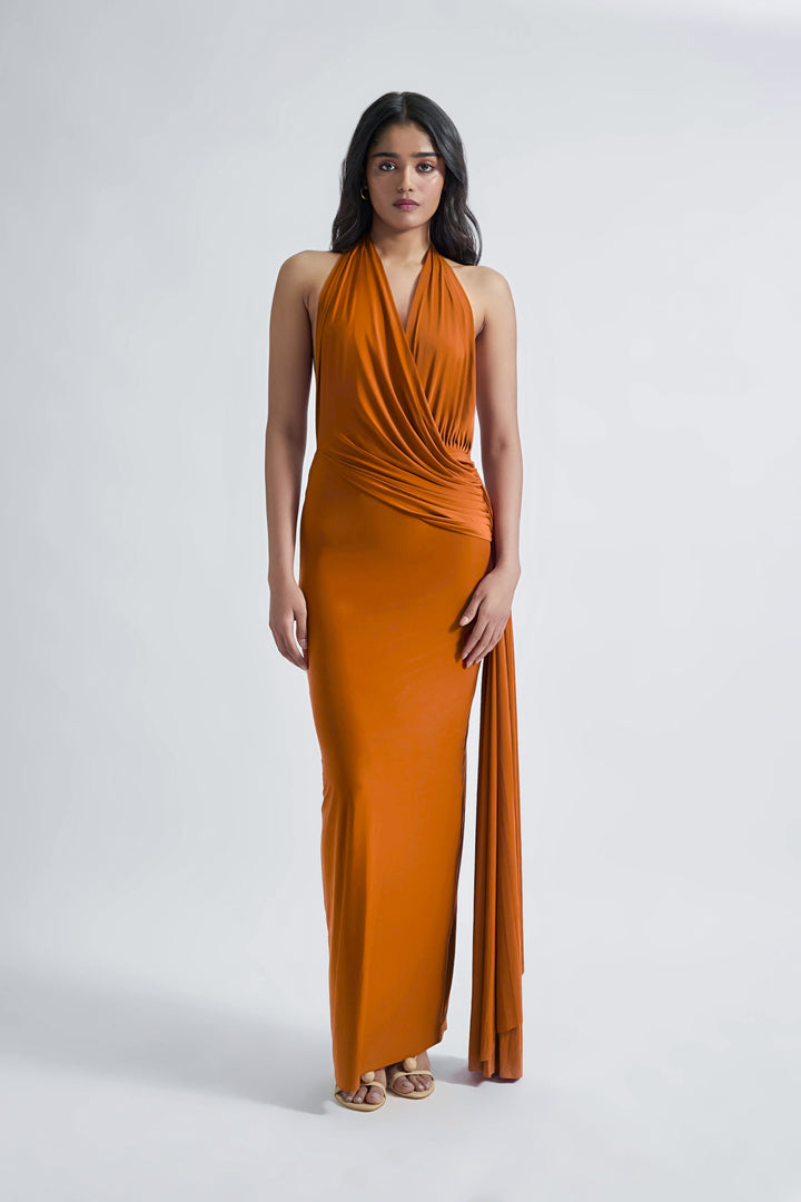 This elegant coul dress, with a drape, creating a flattering neckline and a soft, feminine silhouette. The straight-fitted bottom is meticulously tailored to accentuate your curves, providing a sleek, polished finish. Crafted from high-quality materials, this dress seamlessly blends sophistication with modern style, making it perfect for any special occasion.