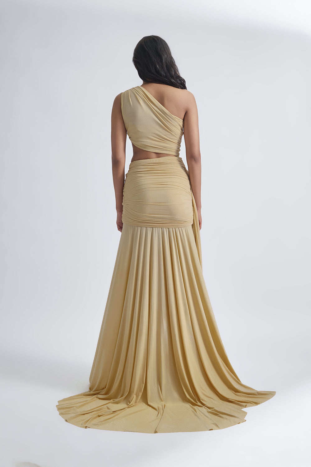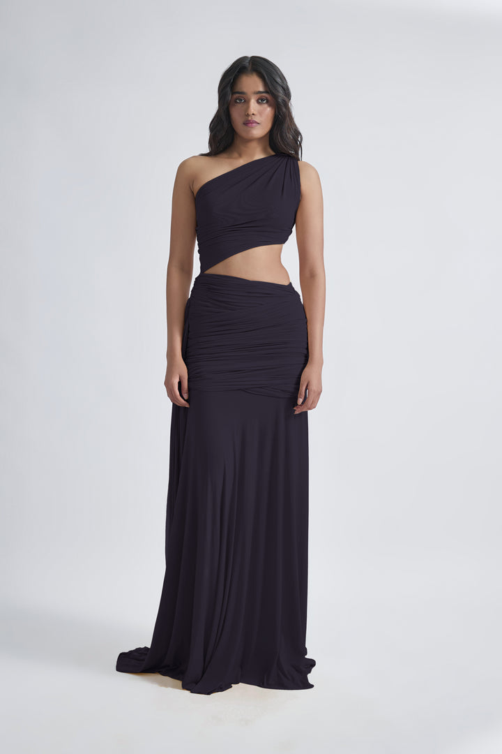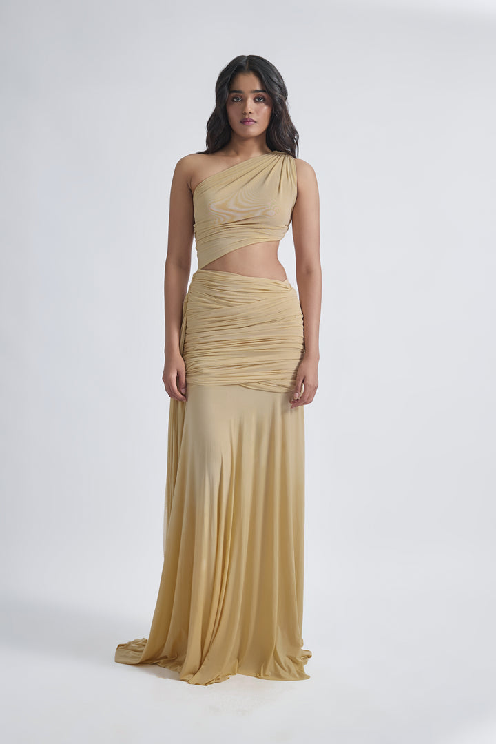 This one-shoulder gown combines an asymmetric net top witha bustier detail underneath, and heavy ruching on the hips area with a classy flared skirt, creating a sophisticated and stylish silhouette. Crafted from Malai Lycra and net, this gown offers a luxurious feel and beautiful drape, making it perfect for a variety of formal occasions and events.