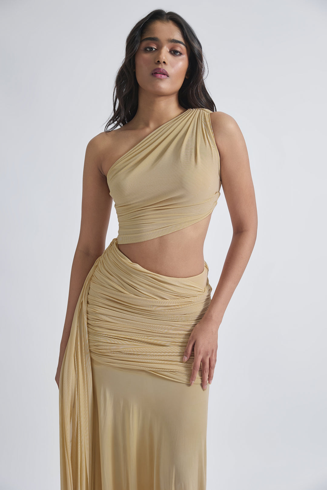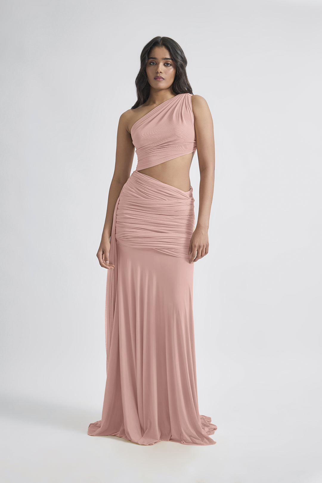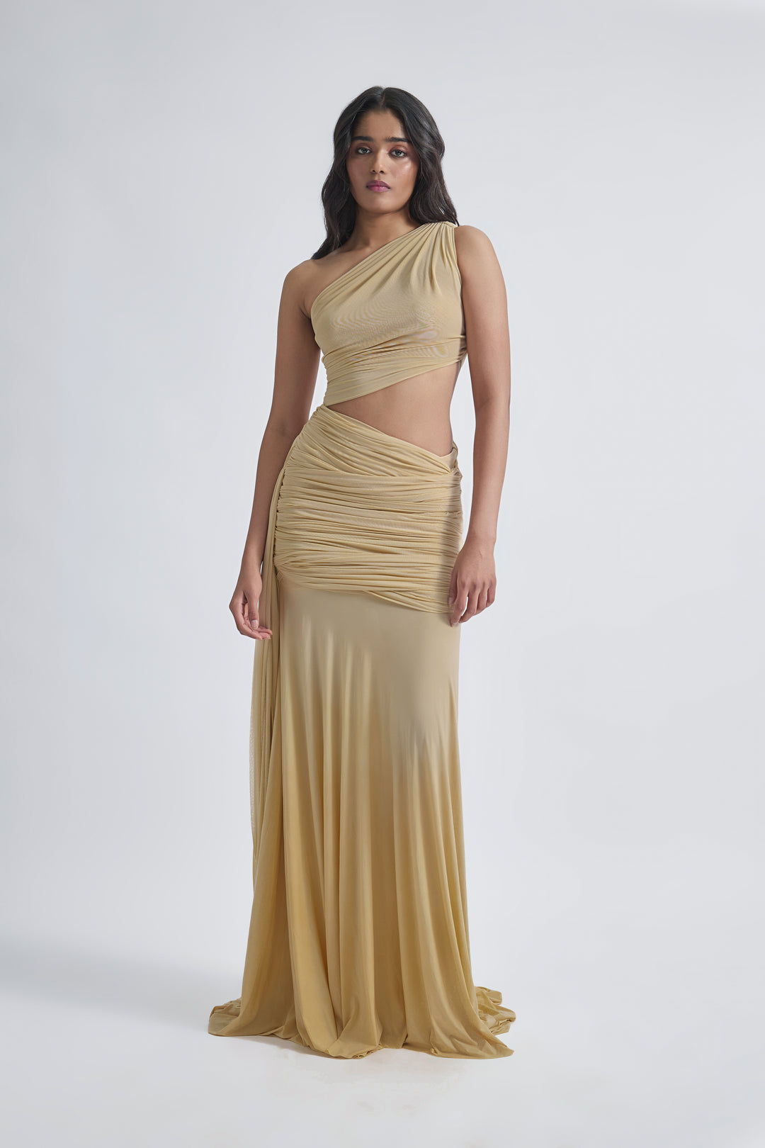 This one-shoulder gown combines an asymmetric net top witha bustier detail underneath, and heavy ruching on the hips area with a classy flared skirt, creating a sophisticated and stylish silhouette. Crafted from Malai Lycra and net, this gown offers a luxurious feel and beautiful drape, making it perfect for a variety of formal occasions and events.