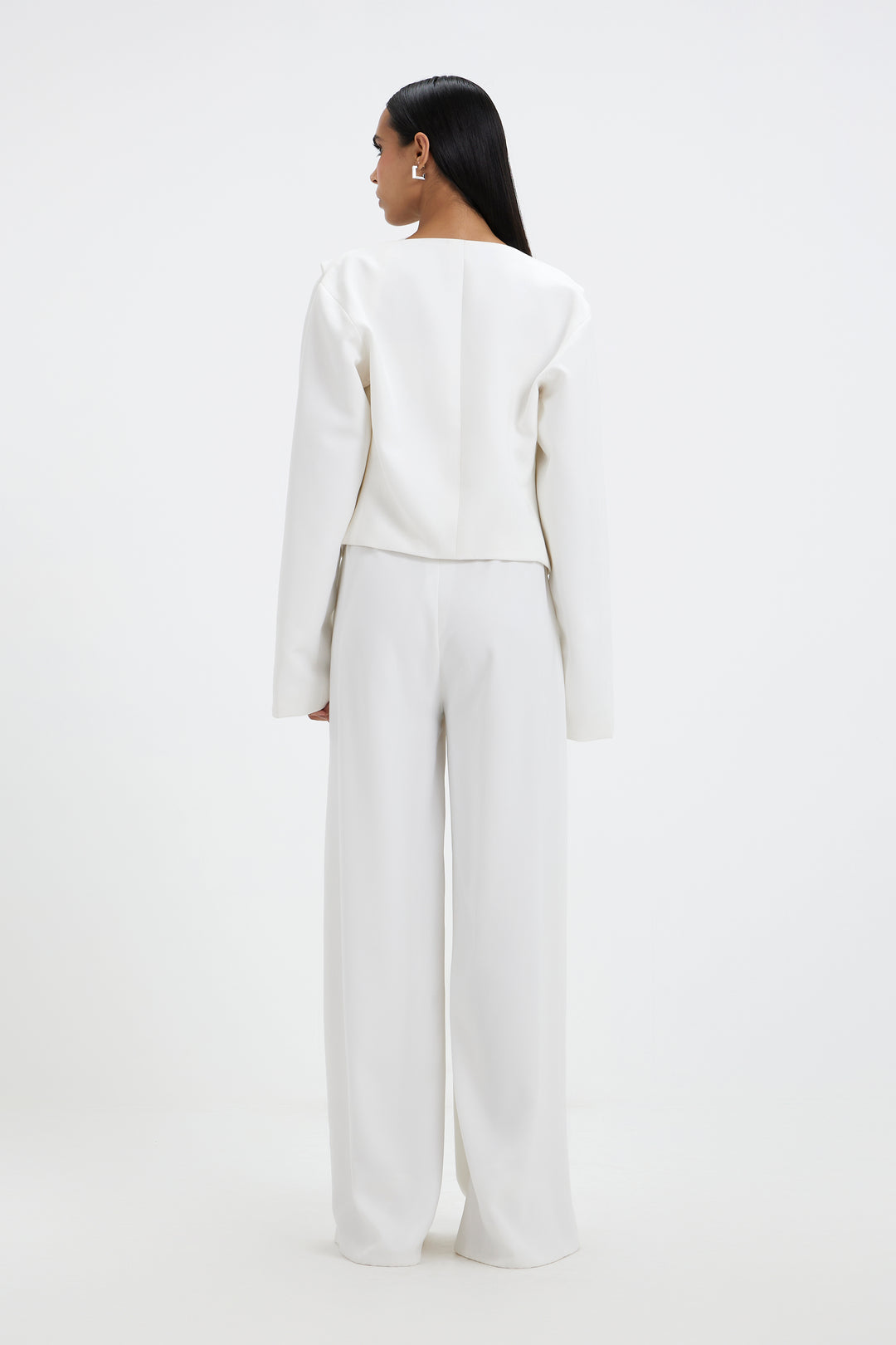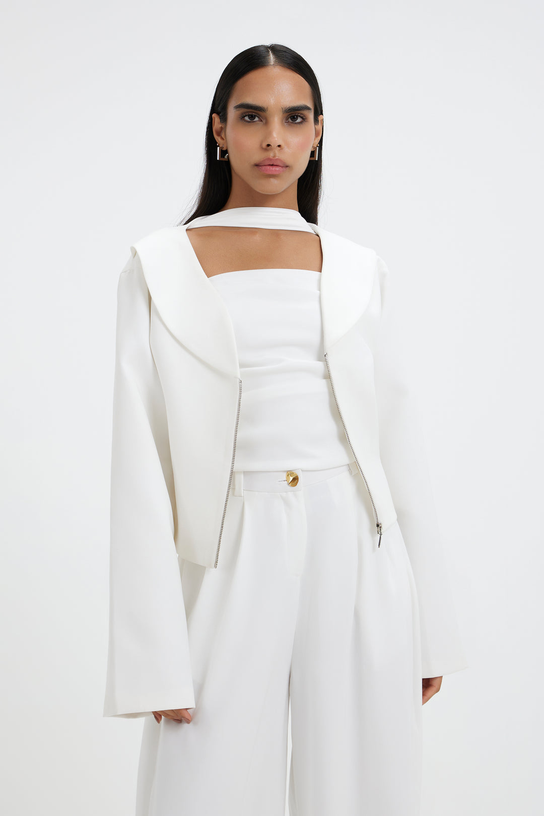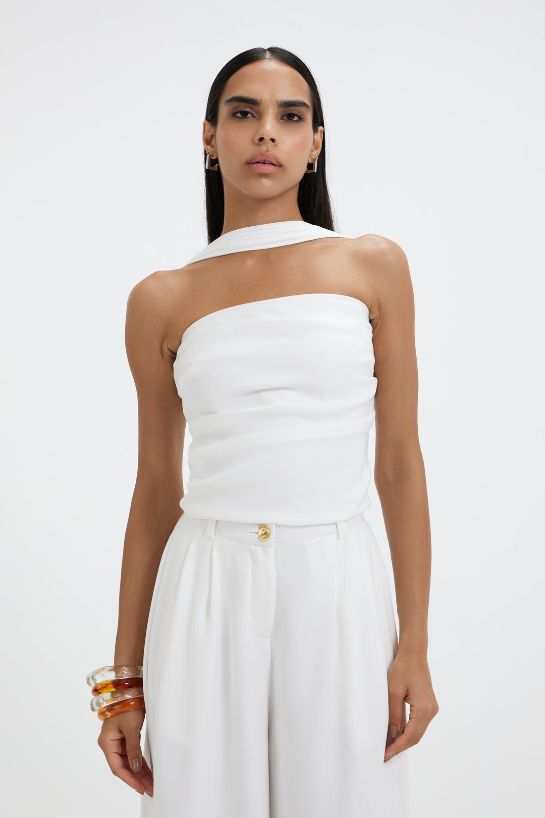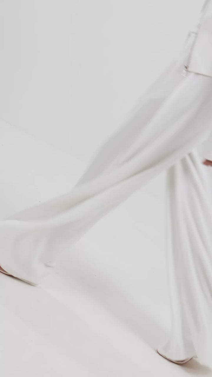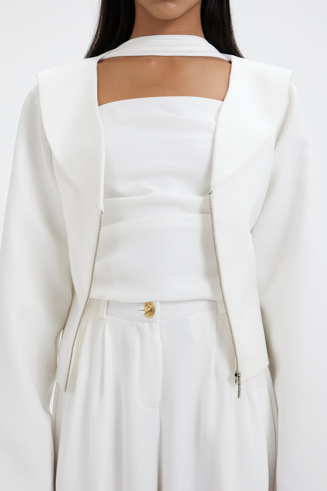 White top with a neck detail, which is tailored in a clean, non-stretch fabric, makes a strong statement. Subtle pleats at the waist precisely contour the body, while a side slit gives the form movement. It is made to seem sharp but carefree, and for a simple, contemporary finish, it is paired with tailored flared pants.