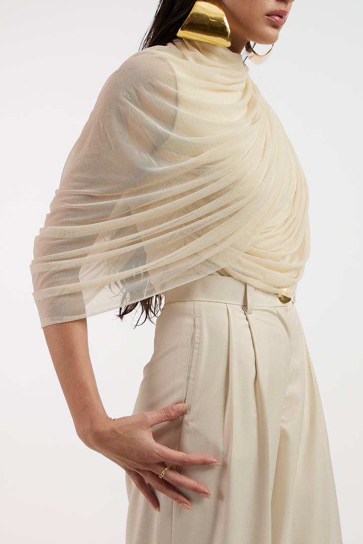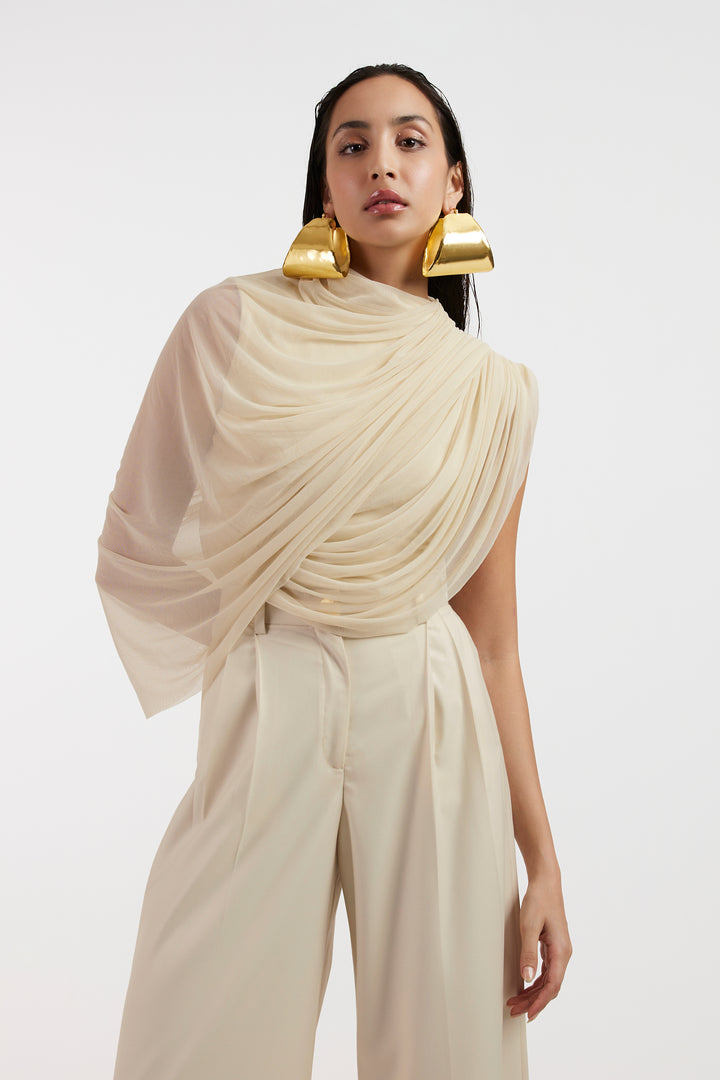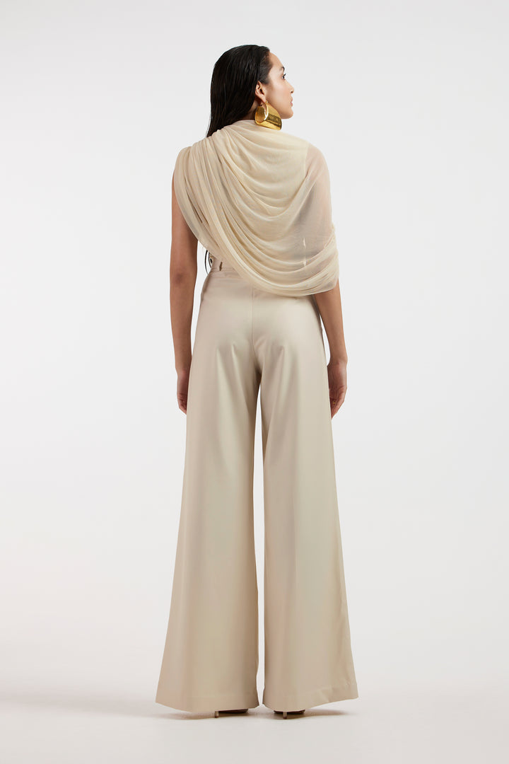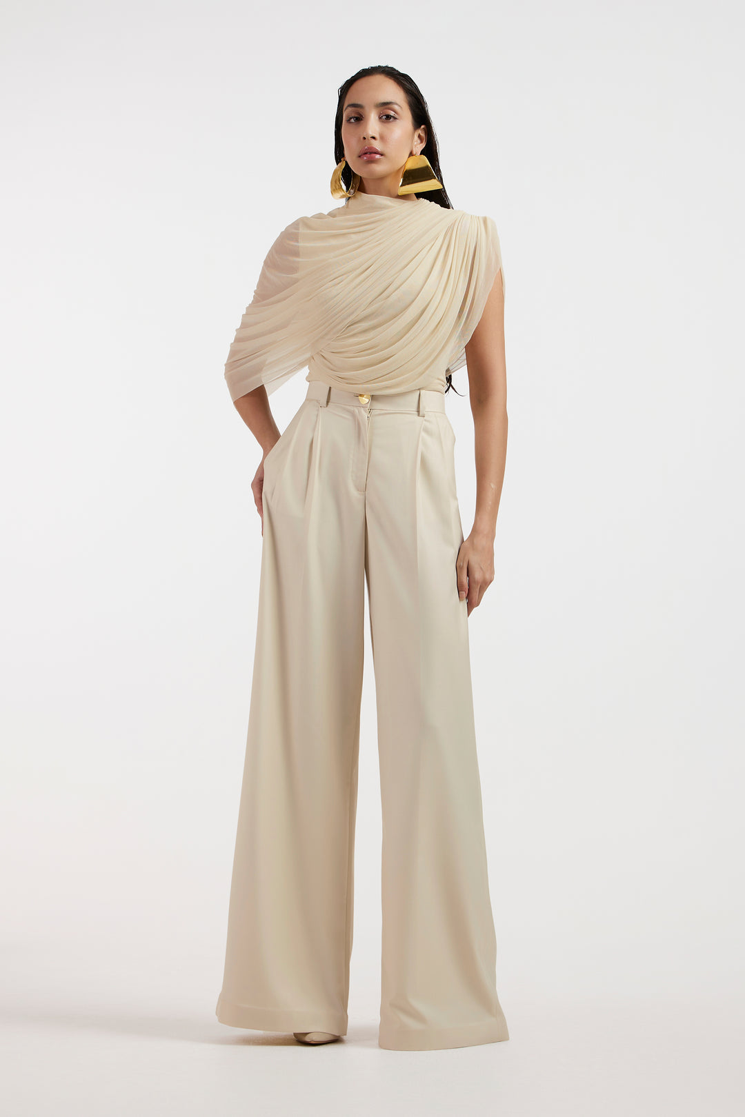 The look features an asymmetric draped bodysuit top with soft pleats that gracefully fall along the body, adding texture and movement. It's paired with flared, low-waisted trousers that offer a streamlined, tailored silhouette, enhancing the overall refined aesthetic. The ensemble is finished with a striking trench coat, highlighted by bold, oversized collars that bring a touch of drama and sophistication.