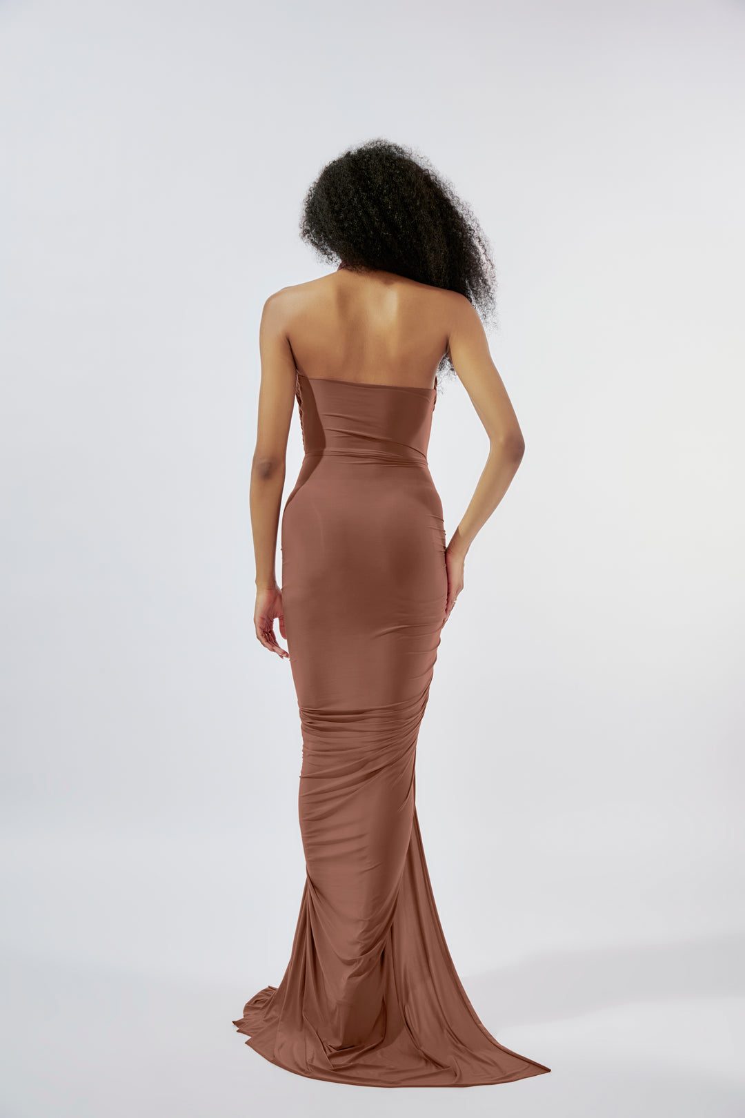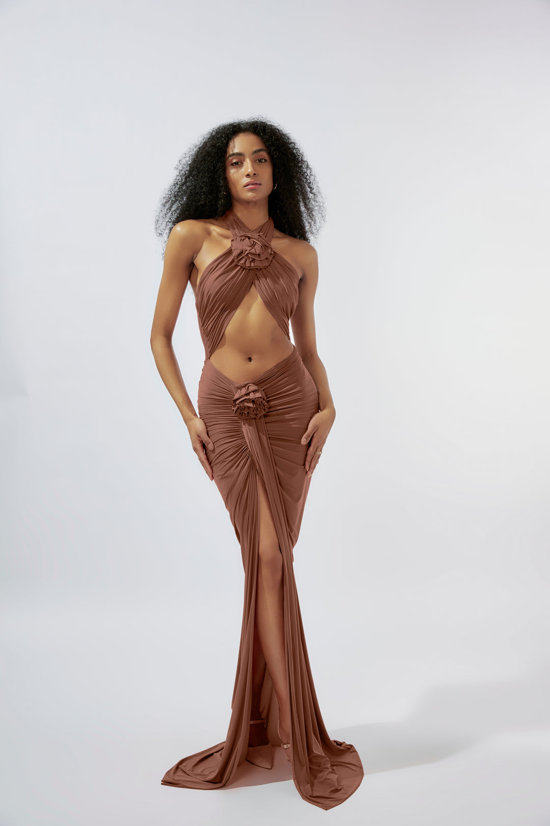 Emerge in ethereal sophistication with this exquisite malai lycra gown. Its captivating design features a criss-cross bodice that accentuates the figure with timeless elegance. The gracefully draped skirt adds a touch of fluidity and movement, ensuring an enchanting silhouette with every step. Delicate rose detailing adorns both the top and bottom, infusing the gown with a romantic charm that is simply mesmerizing.