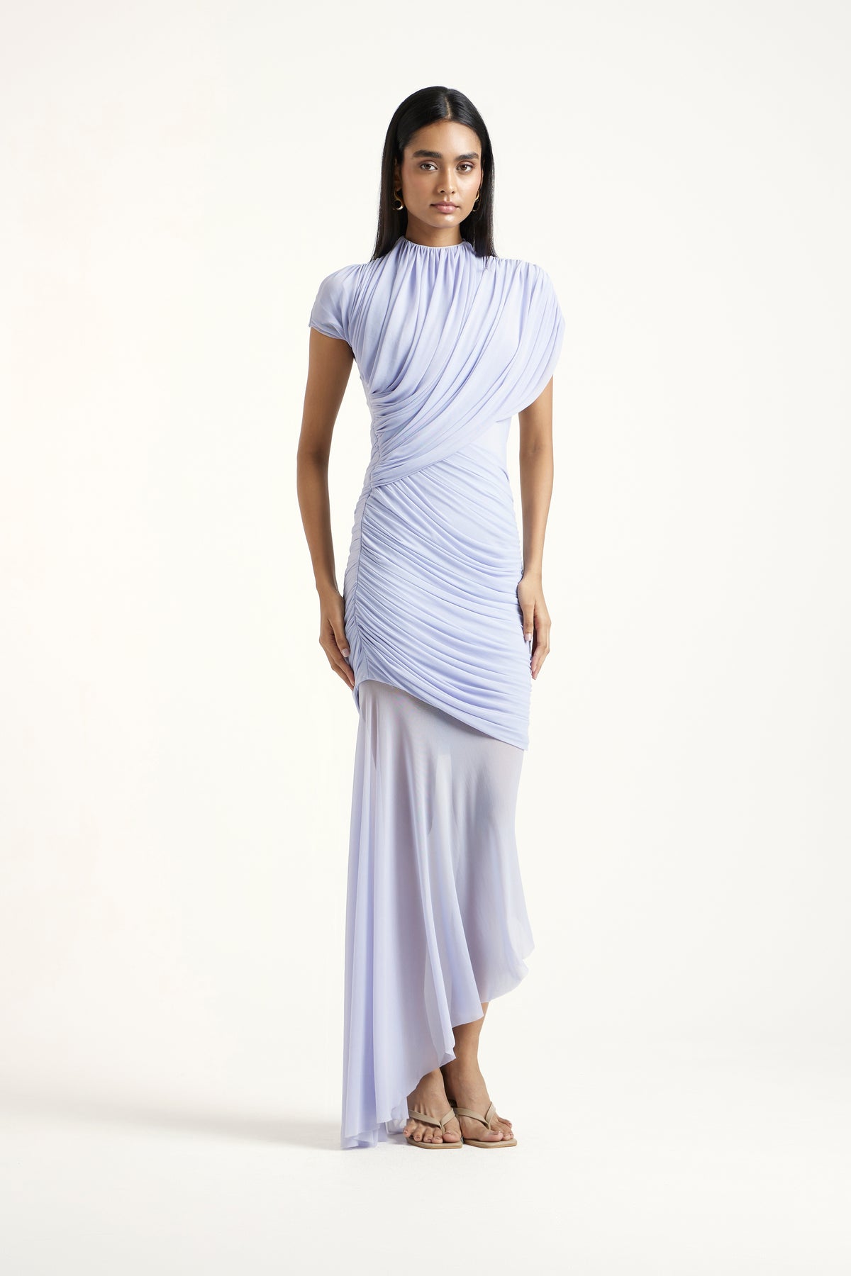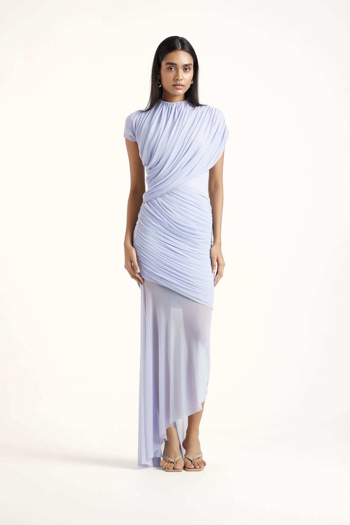 The Alina Dress is a softly draped gown crafted in net and malai, featuring elegant cross-body pleating and a sleek cap-sleeve silhouette. Its asymmetric hem and sculpted fit create a refined, feminine look—perfect for graceful, elevated occasio