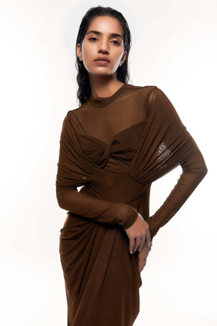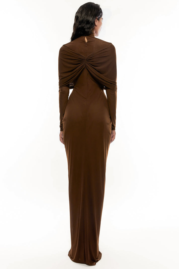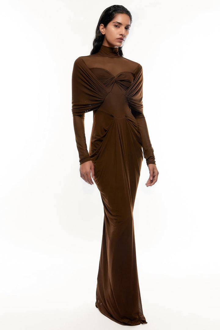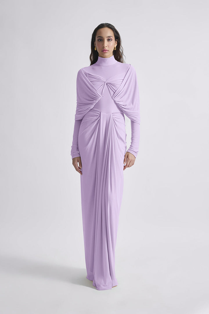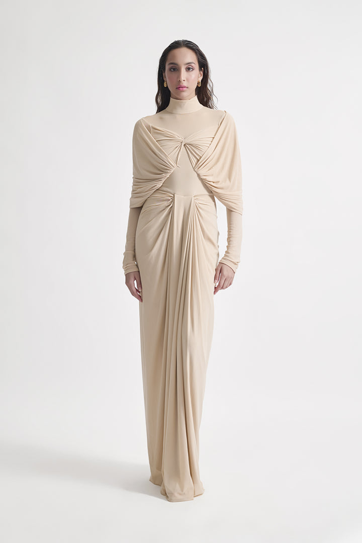 This high-neck draped dress is a testament to timeless elegance and sophisticated design. The high neckline provides a refined, classic touch, while the expertly crafted draping creates a fluid and graceful silhouette. The pleated bottom adds movement, enhancing the dress's overall elegance. Drapes cascading over the shoulders further elevate the design, offering a dramatic yet tasteful flair. Perfect for formal events and special occasions, ensuring the wearer stands out with a striking, polished look.