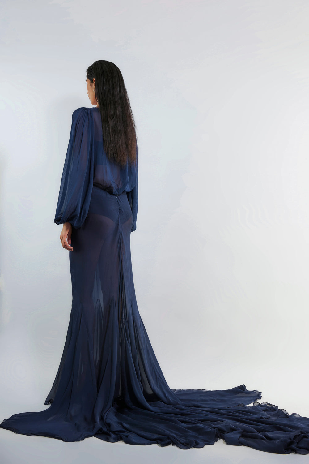 A flowy trail chiffon skirt with a chic blouse and a fitted malai tube bustier offering a soft ethereal and romantic look. Delicate details like subtle ruching at the waist and bustier enhancing the femininity of the ensemble, makes it a standout piece for your special occasion.