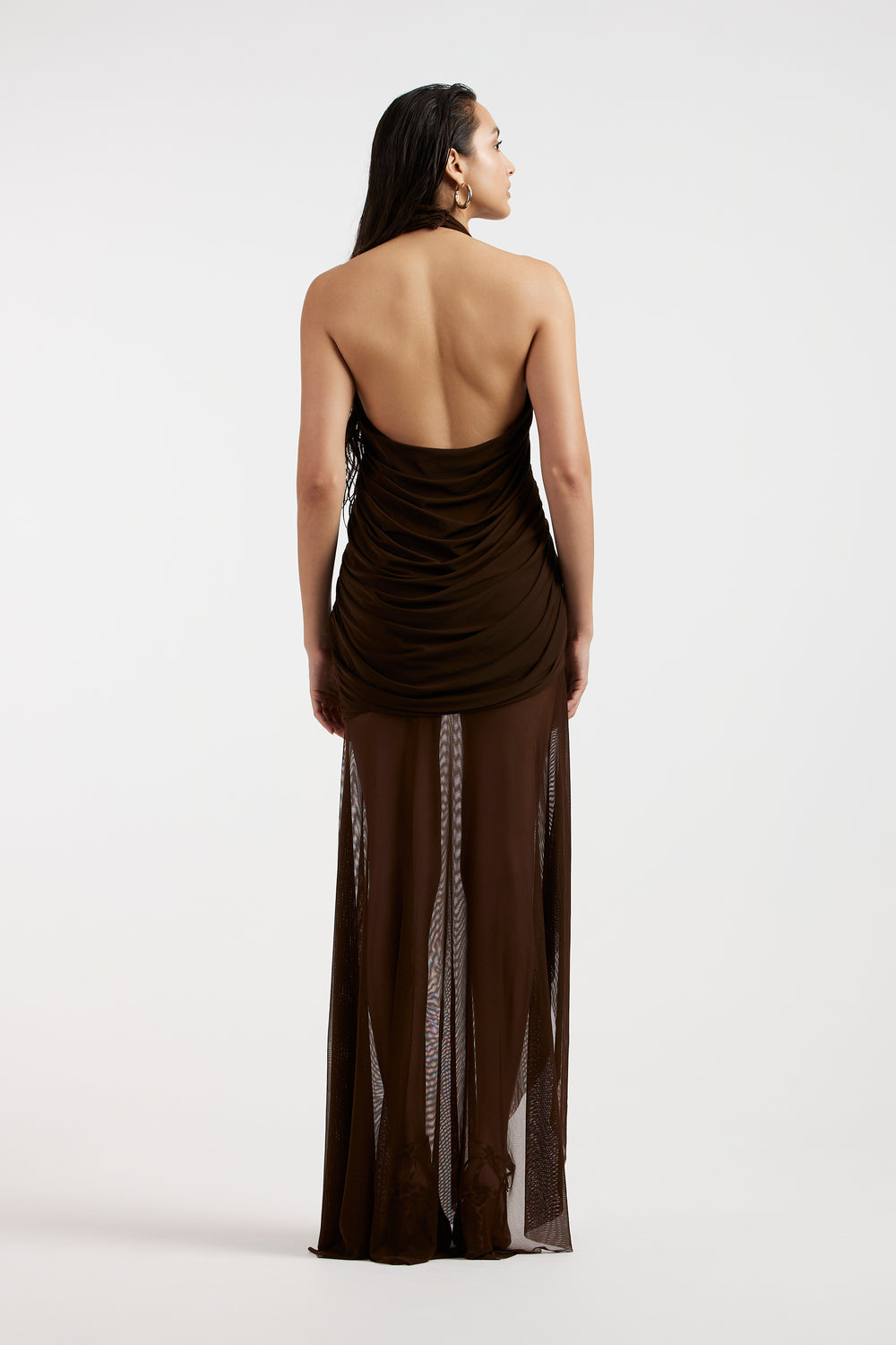 Indulge in the allure of sophistication with this malai lycra draped gown, adorned with flared mesh for a touch of whimsical charm. The twisted draped bodice defining the body from the front while the cowls defining elegance at the back. Flowing from the waist down, the flared mesh add movement and dimension, creating an enchanting aura as you glide across the room. This dress exudes timeless elegance and feminine grace, ensuring you stand out with effortless poise and style.