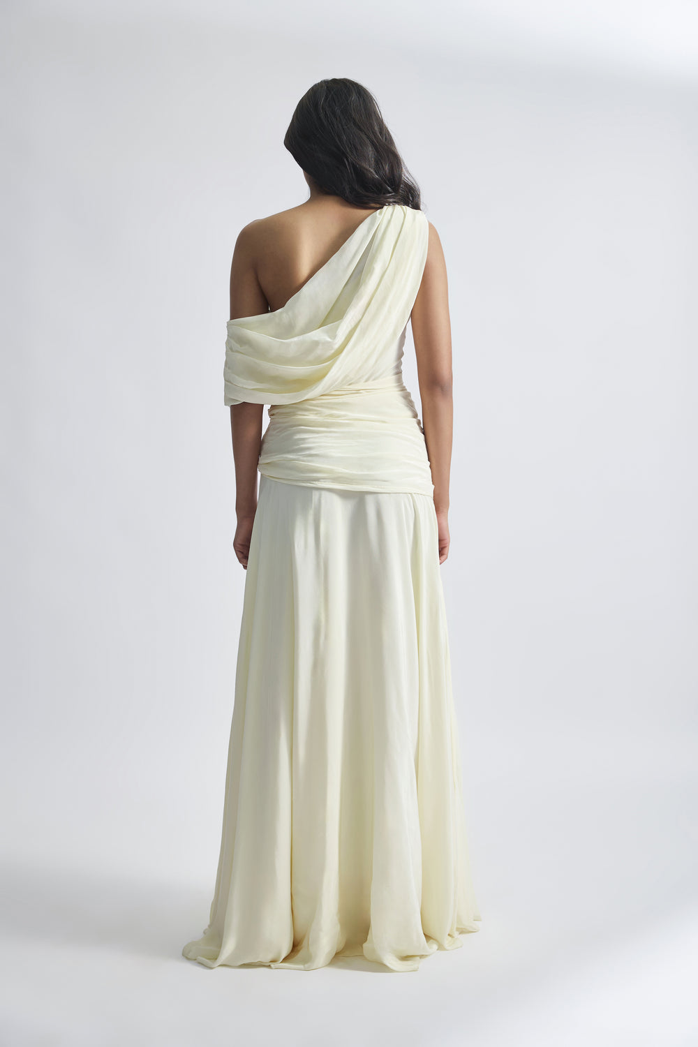 This ethereal gown features a one-shoulder design and is crafted from flowy crepe in a dreamy off-white shade, exuding delicate sophistication. The soft drape gracefully falls over the hips, enhancing the gown's elegant silhouette, while a slit on the front thigh adds a touch of allure and modernity. This is a timeless, romantic look perfect for making a captivating impression at any formal event.