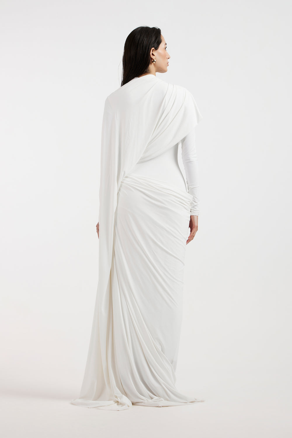 The malai lycra gown features a fitted body that highlights the natural silhouette, with full sleeves and a cowl detail at the low waist adding texture and interest. An asymmetrical cape-like drape extends from the design, creating a sense of flow and movement. The soft and stretchy fabric ensures a comfortable fit while maintaining a sleek appearance. The combination of the fitted body, low-waist cowl, and flowing cape detail offers a balanced and unique design.