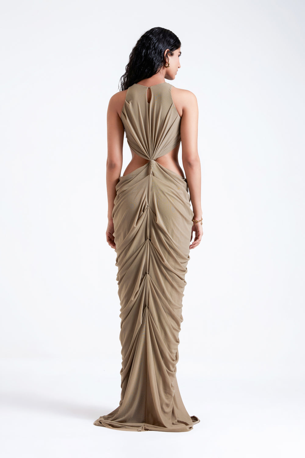 This gown combines the ethereal grace of net fabric with the luxurious feel of malai lycra. The design features a fully draped silhouette that flows effortlessly, enhanced by two striking side waist cut-outs. Each cut-out is adorned with cascading cowls that add a touch of sophistication and movement. The interplay between the draped fabric and the elegant cowls creates a look that is both refined and alluring, making it an ideal choice for a glamorous evening event.