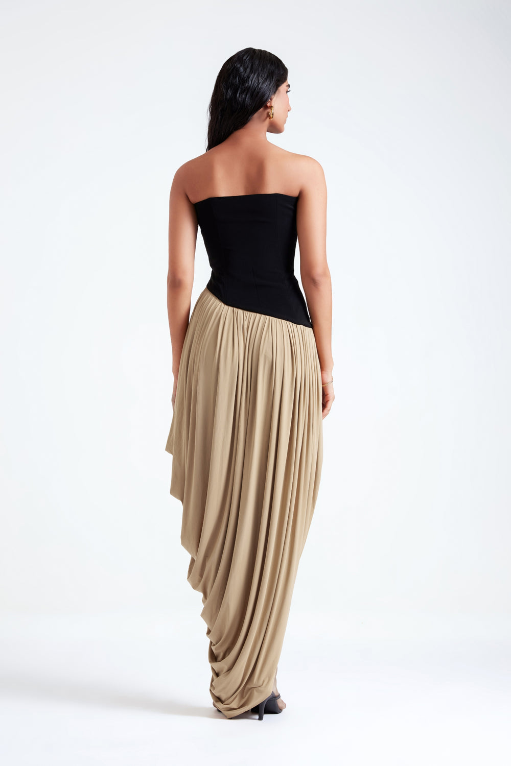 This eye-catching dual-tone gown blends contemporary design with classic elegance. The asymmetrical drop waist creates a unique silhouette, while the corseted top offers structured support and a flattering fit. The gown transitions into a dramatic balloon skirt, adding volume and movement with every step. The dual-tone fabric highlights the gown’s modern aesthetic, making it perfect for making a bold statement at any formal event.