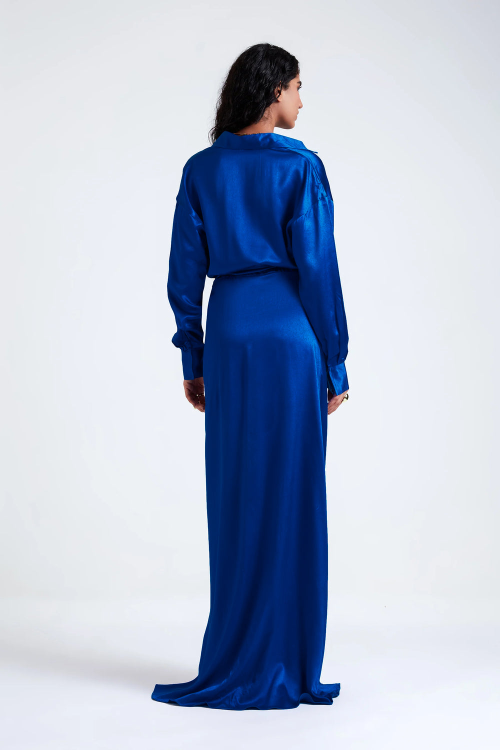 This bold gown in electric blue heavy satin combines a modern aesthetic with a touch of drama. The design features an oversized collared shirt-style top, giving a unique twist to the traditional gown silhouette. The wrap style enhances the shape while adding a contemporary edge. A dramatic leg slit offers a striking contrast and allows for movement, making this gown a standout choice.