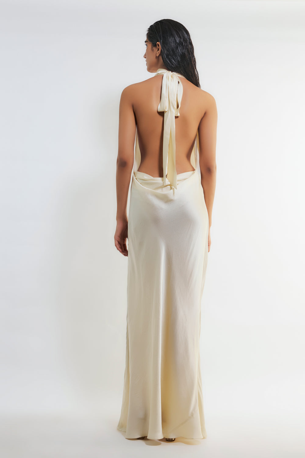 This satin dress boasts a graceful silhouette that effortlessly flatters, enhanced by a high neck cowl detail that adds a touch of sophistication, making it a perfect choice for occasions that demand refined style with a hint of allure.