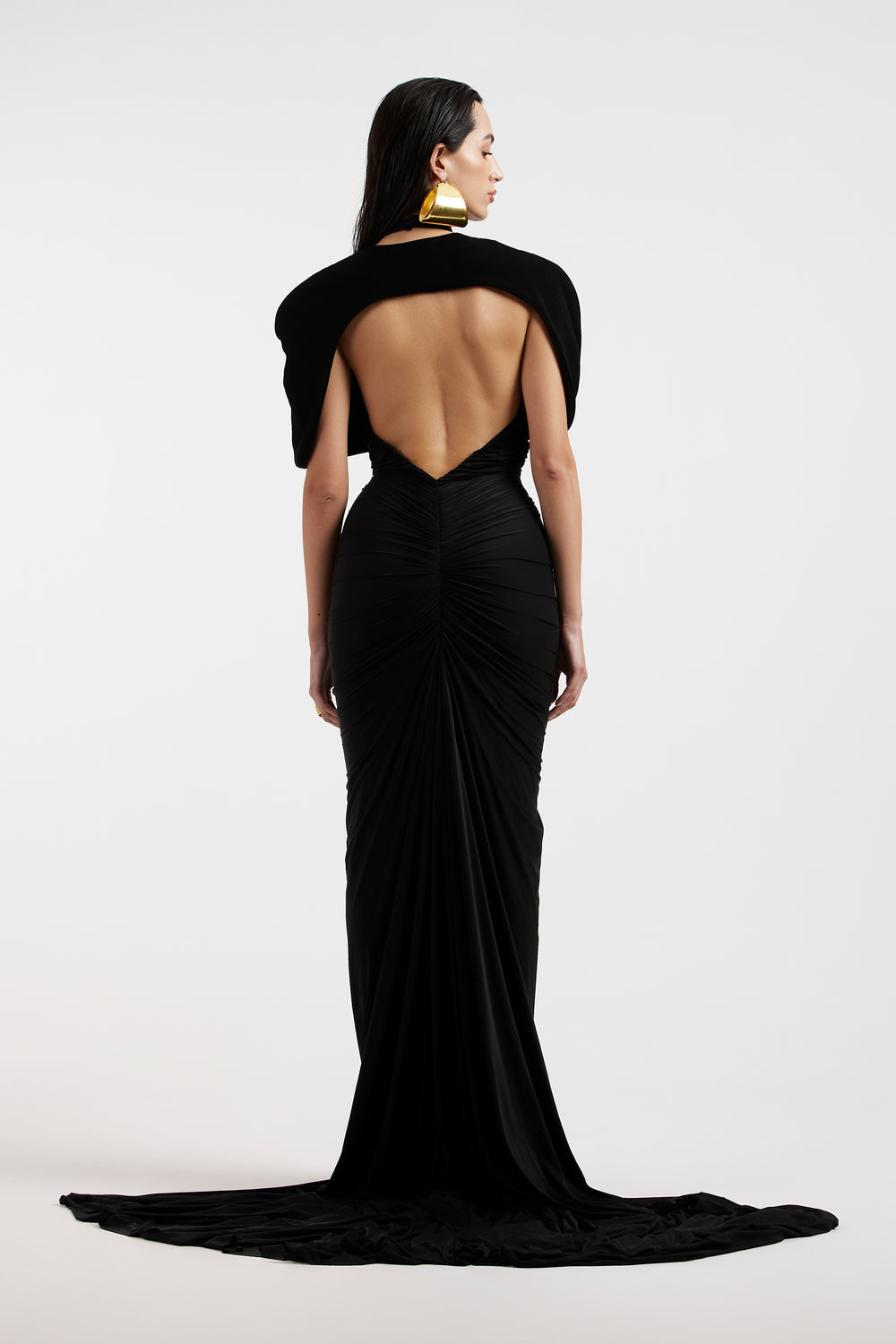 This dress boasts a high neckline, flattering ruching along the waist and hips, a daring low-cut back, and a figure-hugging design that gracefully trails behind for an effortlessly elegant look. The backless cape is removable and looks so elegant.