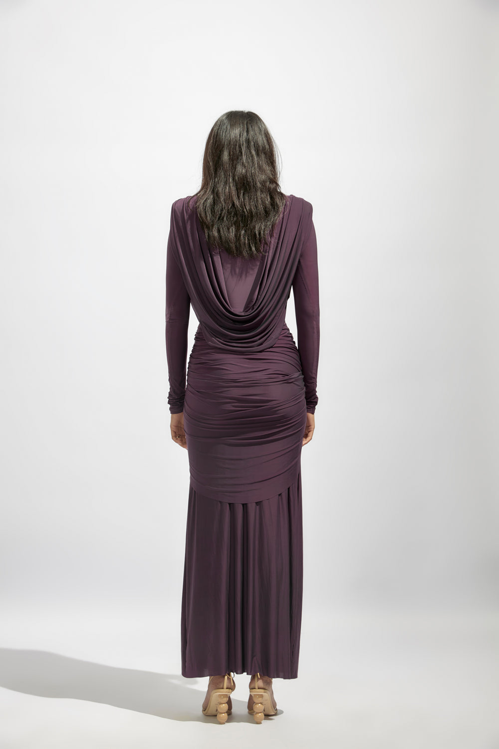 Elevate your ensemble with this elegant dress, adorned with stylish cowls at the top that add texture and interest to the design. The overlapping drape at the bottom creates a graceful silhouette, offering movement and fluidity, perfect for making a statement at any