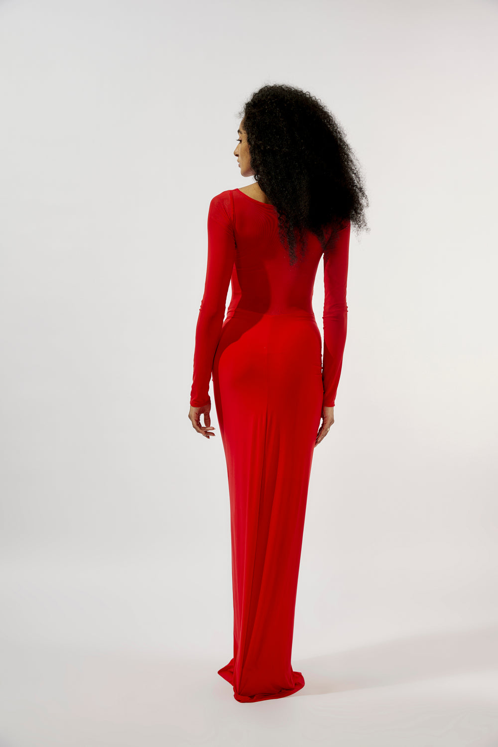Dazzle in this stunning red mesh full-sleeve gown that exudes elegance and allure. The halter neck top adds a touch of sophistication, beautifully framing the shoulders and neckline. A signature ruching detail adorns the skirt, delicately accentuating the stomach area while adding texture and visual interest. This gown is a perfect blend of style and grace, making it an ideal choice for making a statement at any formal occasion.
