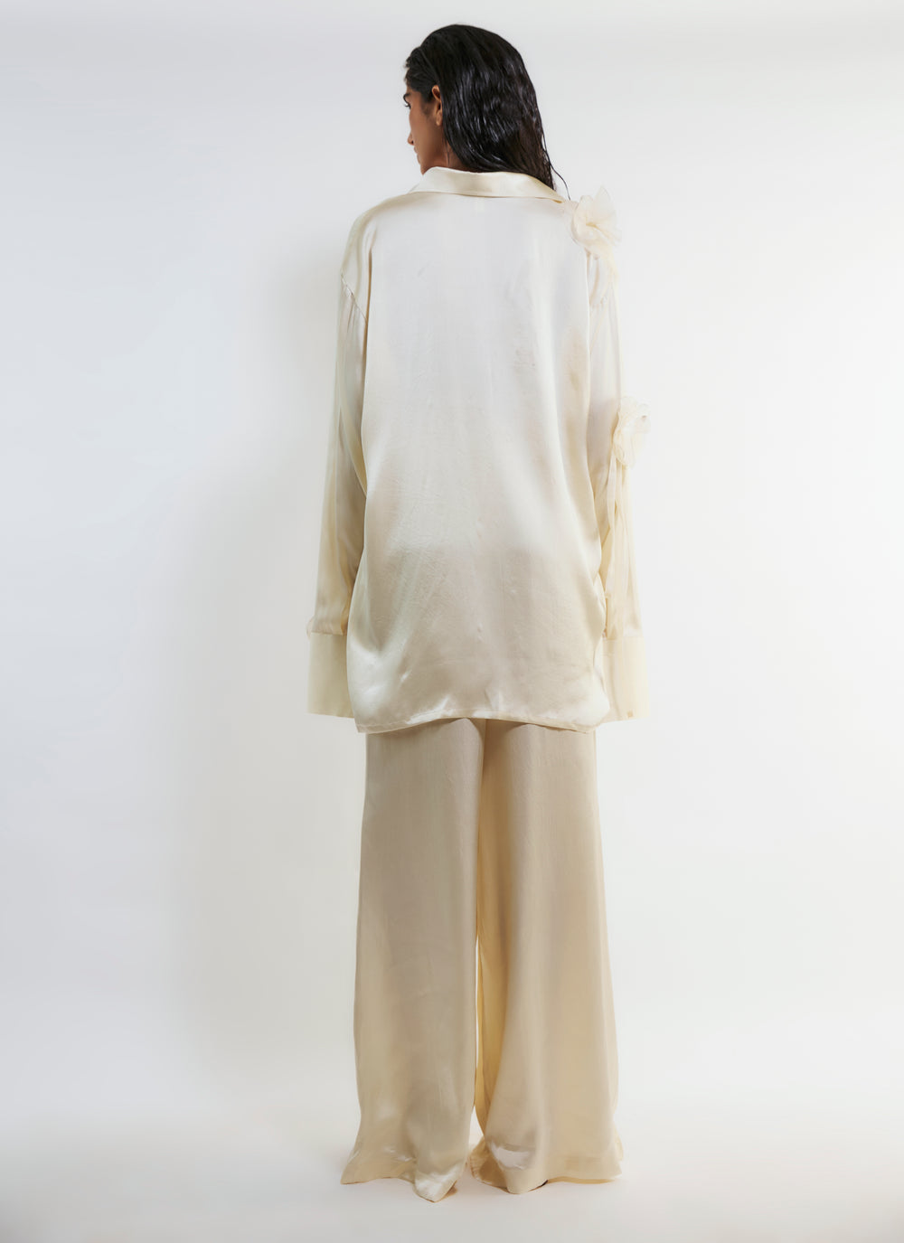 An elegant satin co-ord set featuring an oversized shirt adorned with delicate organza flowers, paired with straight pants, blending luxury with intricate detailing for a refined and chic ensemble.