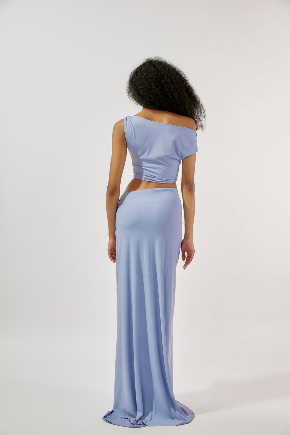 Effortlessly chic, this ensemble features a stunning peri blue one-shoulder asymmetric top paired with an asymmetric cowl detail skirt. The unique silhouette creates a sense of modern elegance, while a small golden buckle on the top adds a touch of sophistication, enhancing the overall beauty of the outfit. Perfect for those seeking to make a bold yet refined statement at any special occasion.