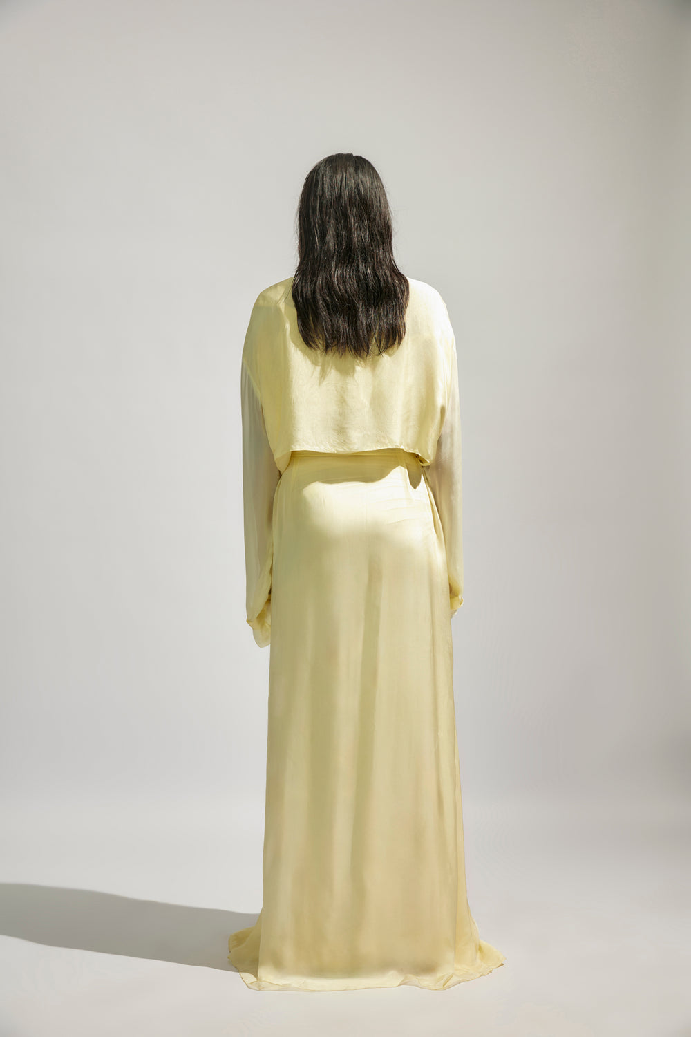 Elevate your ensemble with this chic draped shoulder crop top paired with a graceful long skirt, adorned with flattering ruching along the side. The top's draped shoulder detail adds a touch of elegance, while the skirt's ruching enhances your silhouette, creating a look that effortlessly combines modernity with timeless style. Perfect for a variety of occasions, from casual gatherings to formal events, this ensemble is sure to make a memorable impression with its sophisticated flair.