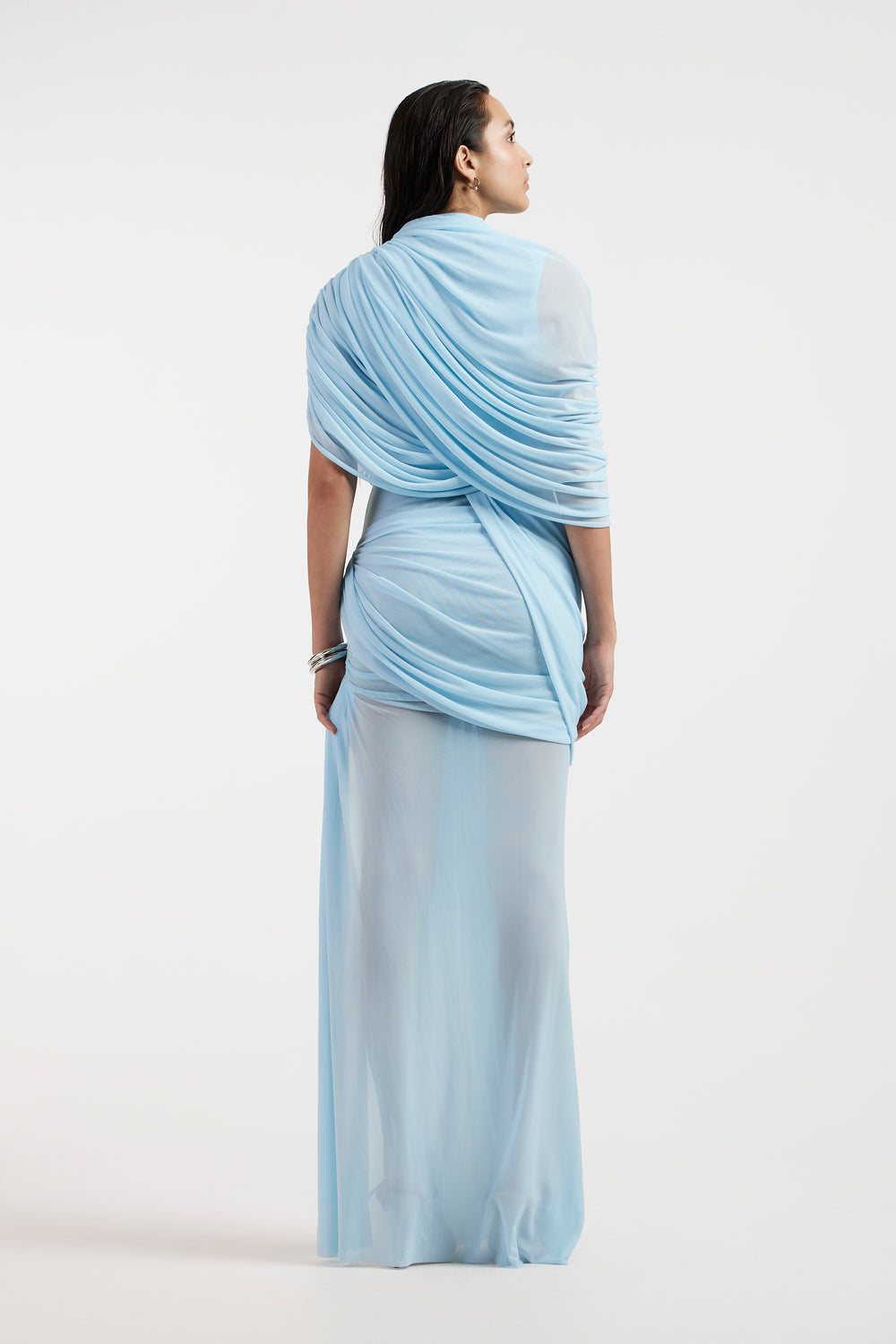 This captivating dress boasting a fully draped top and bottom, adorned with intricate pleated drapes for added texture and dimension. The artful draping creates a sense of movement and fluidity, while the pleated accents add a touch of sophistication and elegance. Perfect for making a statement at any special occasion, this dress effortlessly combines modern style with timeless charm, ensuring you exude confidence and grace with every step.
